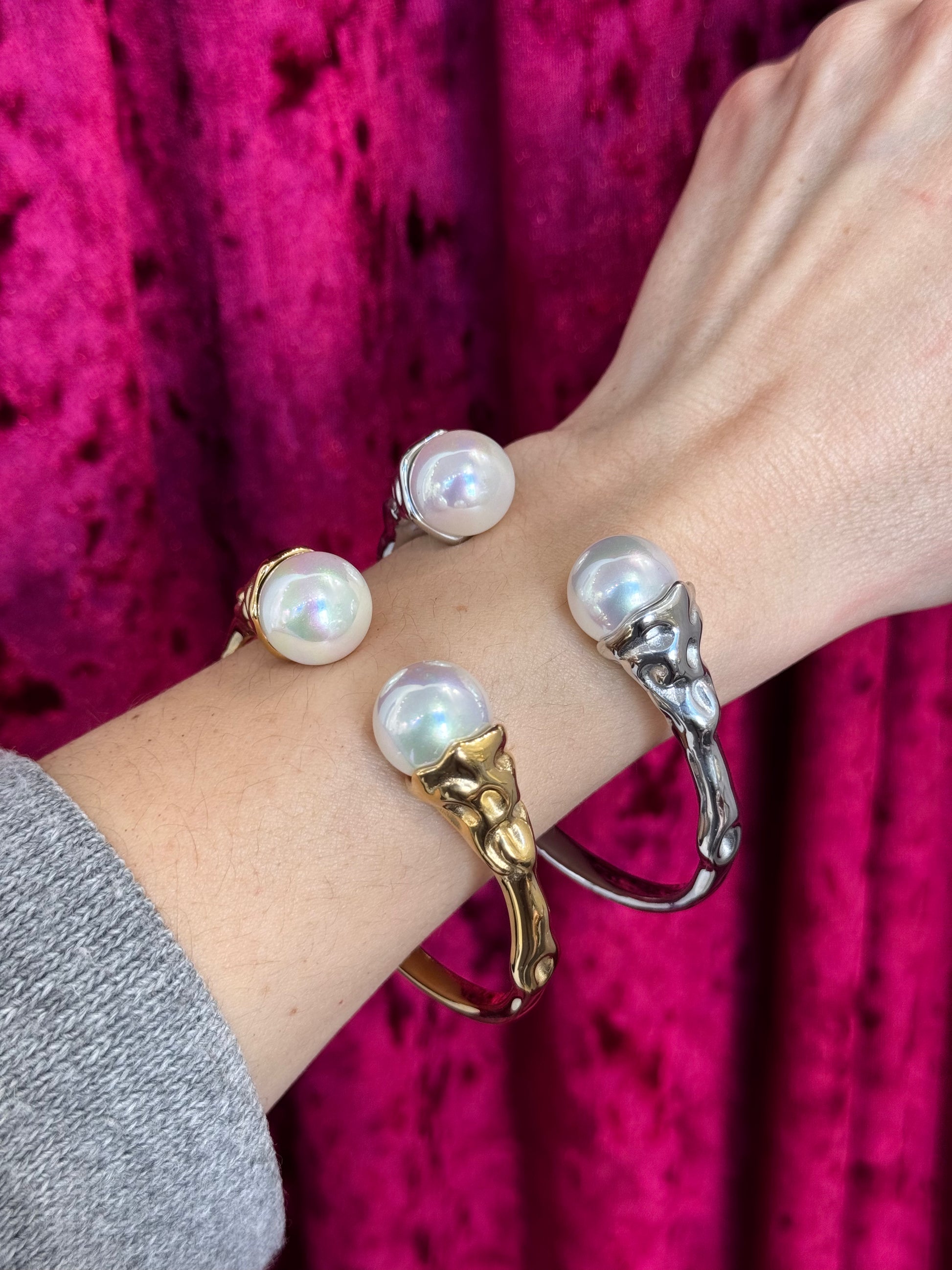 Η συνάντηση της φύσης με την υψηλή αισθητική. Η χειροπέδα Perla Shell ξεχωρίζει για τον μοναδικό, "λιωμένο" σχεδιασμό του μετάλλου που αγκαλιάζει στις άκρες του δύο μεγάλα, ιριδίζοντα μαργαριτάρια. Διαθέσιμη σε χρυσό και ασημί stainless steel, είναι ένα άκρως girly και σοφιστικέ κόσμημα που προσθέτει μια artistic πινελιά σε κάθε σου εμφάνιση. Φόρεσέ τη μόνη της ως statement κομμάτι ή συνδύασε και τις δύο αποχρώσεις μαζί για το απόλυτο bicolor trend.