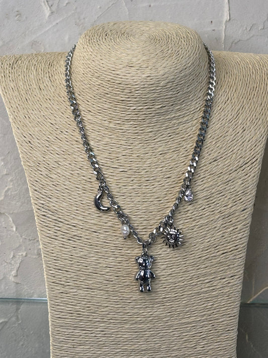 Κολιέ ασημένιο με charms με αρκουδάκι και πέρλες