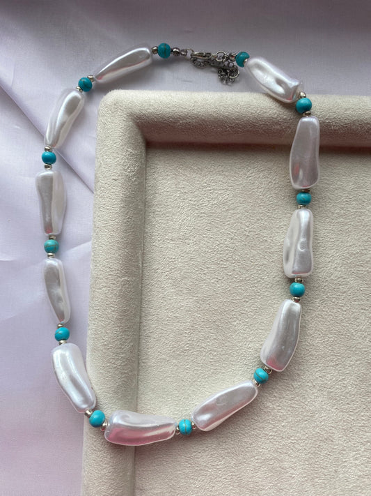 Κολιέ με Λευκές Μαργαριταρένιες Πέτρες & Τυρκουάζ Χάντρες
