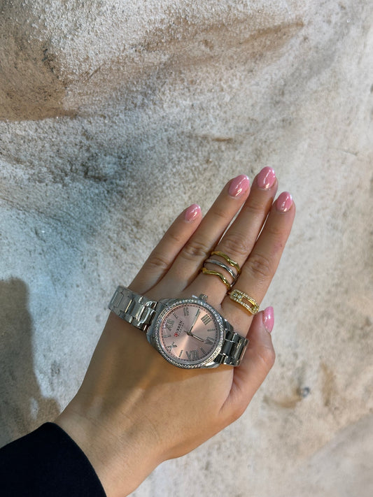 Γυναικείο Στρογγυλό Ρολόι Δίχρωμο με Ροζ Καντράν & Στρας