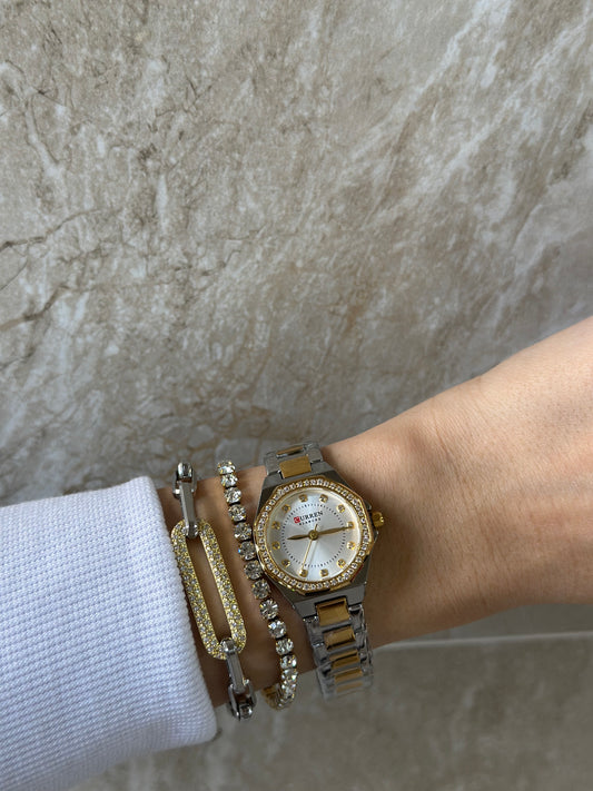 Γυναικείο Παραλληλόγραμμο Ρολόι Δίχρωμο με Λευκό Καντράν & Στρας is