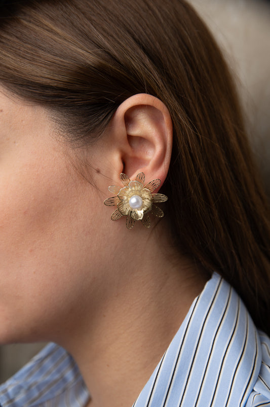 Γυναικεία Χρυσά Σκουλαρίκια Λουλούδι με Πέρλα | Ρομαντικά & Κομψά