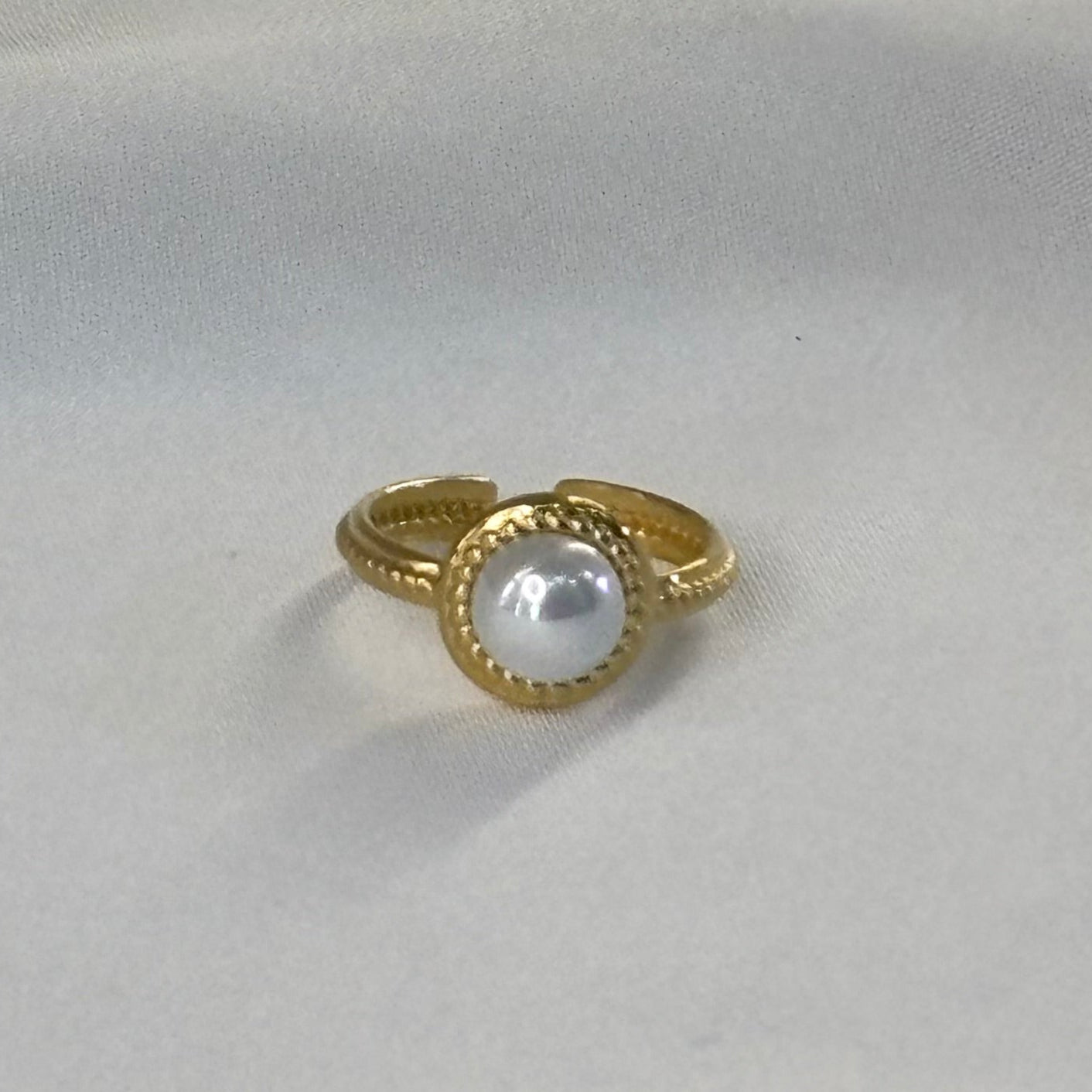 Κομψό γυναικείο χρυσό δαχτυλίδι με ανοιχτό σχεδιασμό και εντυπωσιακό μαργαριτάρι στο κέντρο. Η διακριτική ανάγλυφη λεπτομέρεια του δαχτυλιδιού χαρίζει πολυτέλεια και κομψότητα, καθιστώντας το ιδανικό για elegant εμφανίσεις. Φοριέται μόνο του ή σε layering με άλλα δαχτυλίδια για ένα πιο μοντέρνο look. | Pnoe Studio