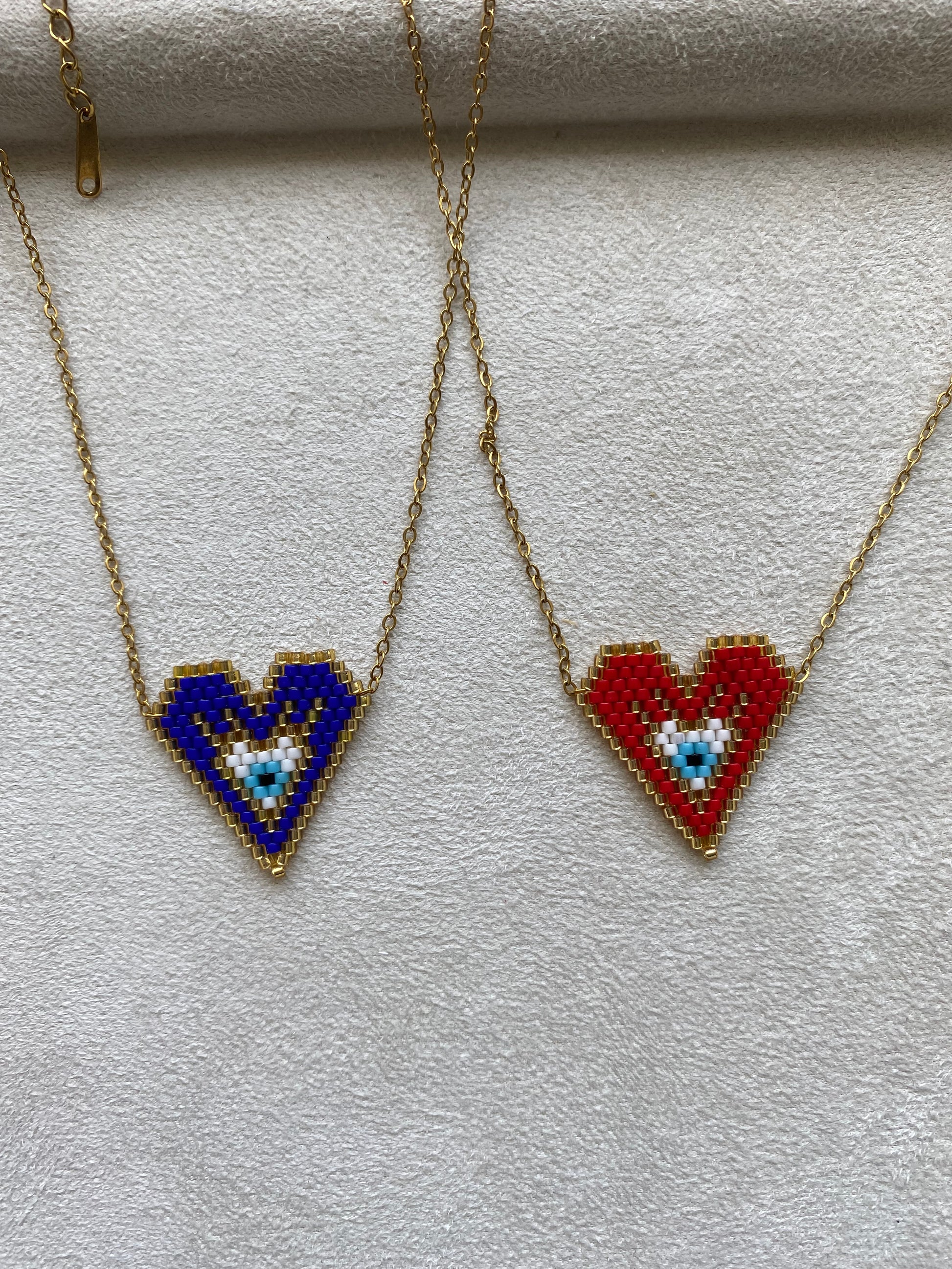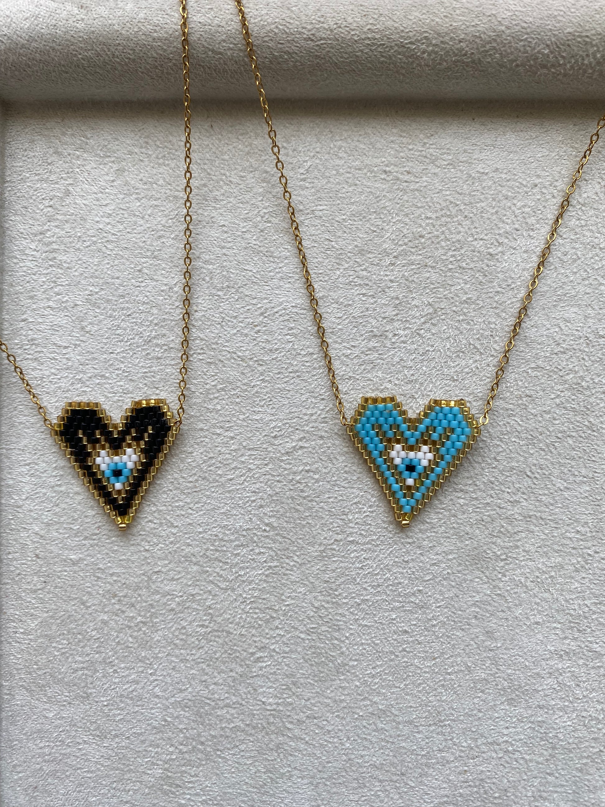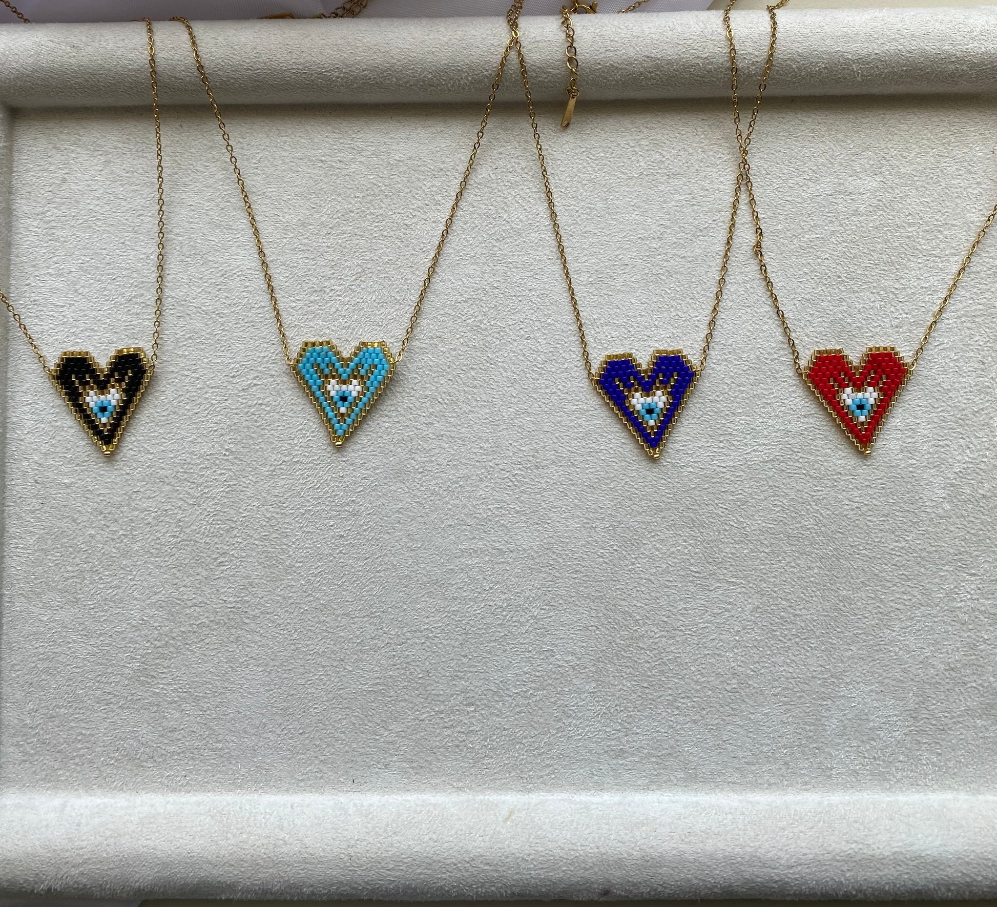Χειροποίητα μενταγιόν καρδιά από χάντρες Miyuki, ραμμένα στο χέρι με προσοχή στη λεπτομέρεια. Το κάθε σχέδιο διαθέτει ένα προστατευτικό μάτι στο κέντρο, ιδανικό για θετική ενέργεια και στυλ. Διατίθενται σε τέσσερις χρωματικούς συνδυασμούς