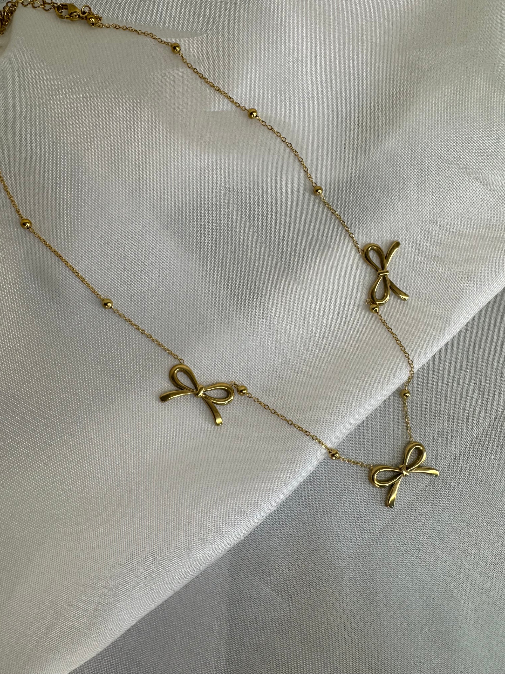 Προσθέστε μια παιχνιδιάρικη αλλά ταυτόχρονα κομψή πινελιά στο look σας με αυτό το υπέροχο κολιέ. Το σχέδιο διαθέτει λεπτή αλυσίδα με μικρές χρυσές μπίλιες και τρεις φινετσάτους φιόγκους, δημιουργώντας μια αίσθηση ρομαντισμού και κομψότητας. Ιδανικό για καθημερινές εμφανίσεις αλλά και για ιδιαίτερες περιστάσεις που απαιτούν ένα διακριτικό και θηλυκό κόσμημα.