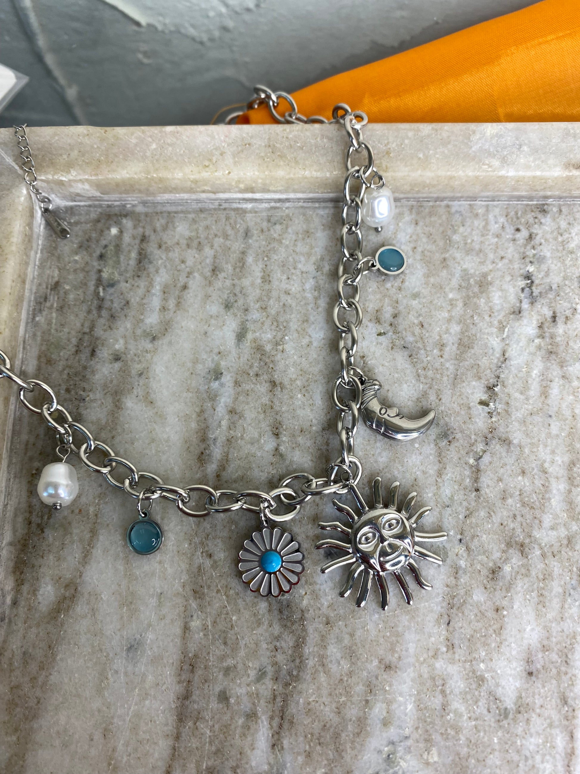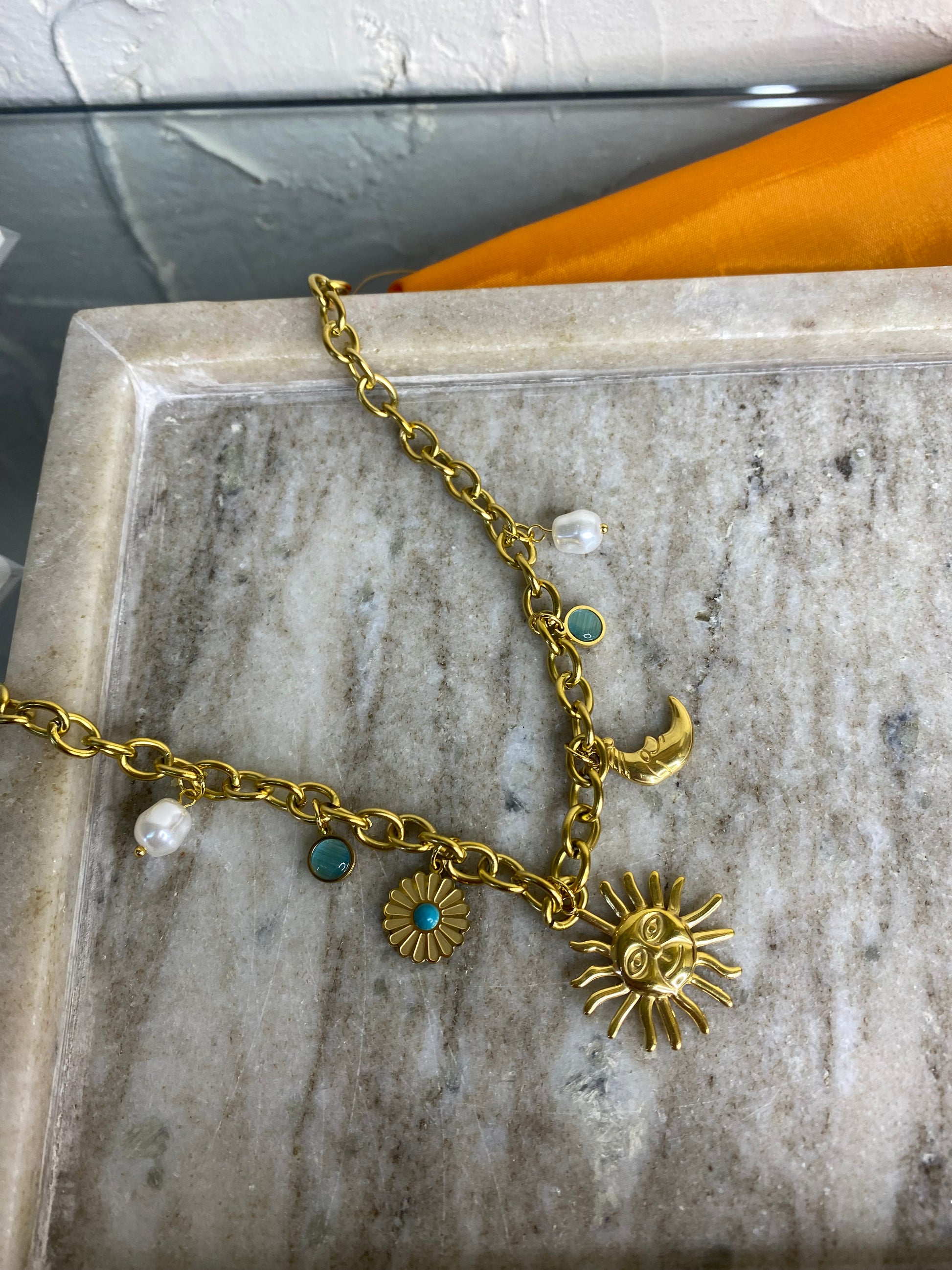 Το “Soluna” είναι μια ωδή στη δυαδικότητα και την αρμονία του σύμπαντος. Μια χειροποίητη αλυσίδα με εντυπωσιακά charms που αναπαριστούν τον ήλιο, τη σελήνη, λουλούδι και μαργαριτάρια γλυκού νερού, συνθέτουν ένα ιδιαίτερο boho-κοσμικό αποτέλεσμα. Διατίθεται σε δύο αποχρώσεις – επίχρυση και επάργυρη – για να διαλέξεις αυτή που ταιριάζει με τη δική σου ενέργεια.