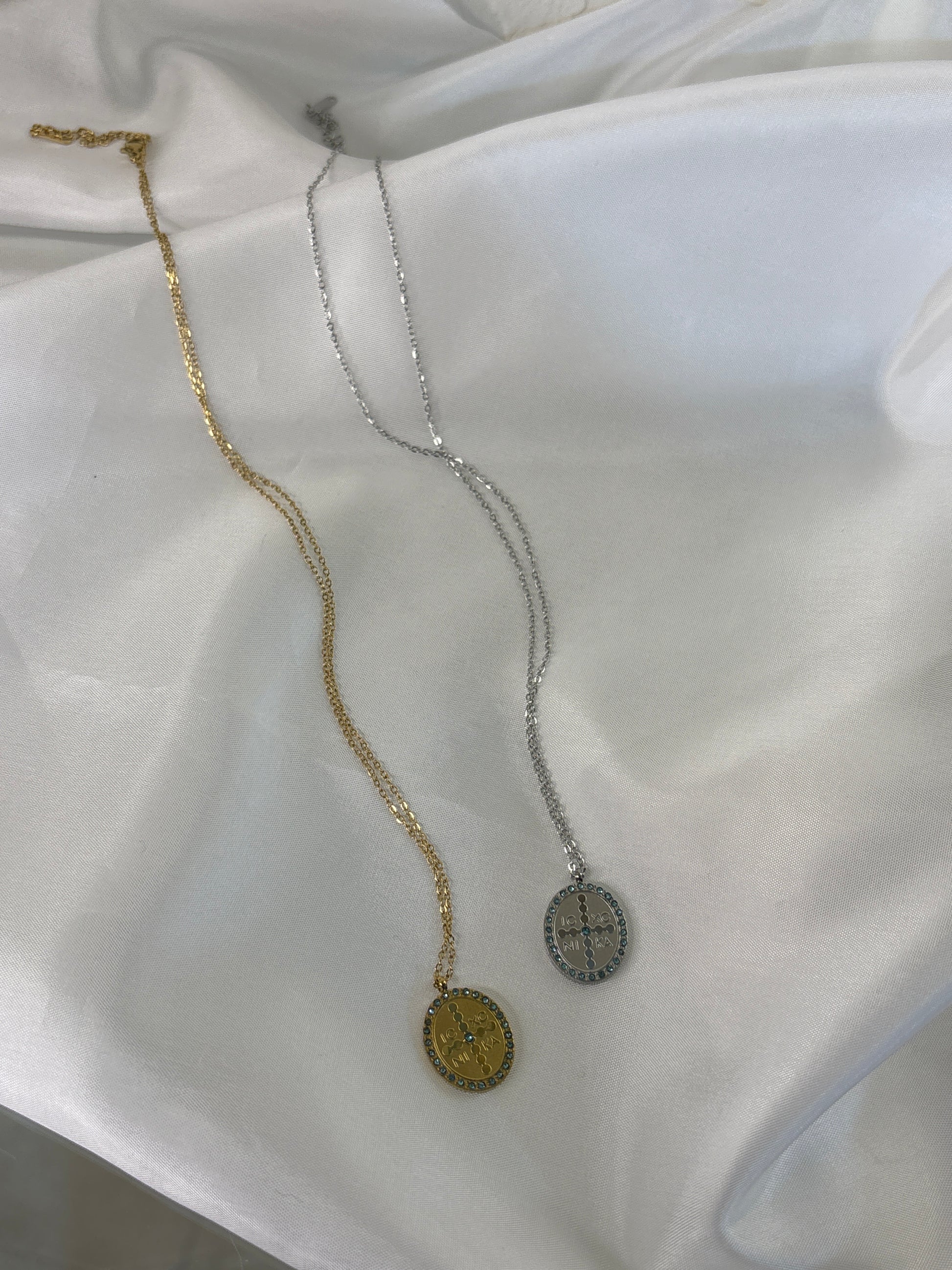 Ένα εντυπωσιακό κολιέ σε χρυσό και ασημί με οβάλ σχήμα κωνσταντινάτο, ιδανικό για να προσθέσετε μία κλασική και κομψή αίσθηση στην εμφάνισή σας. Διαθέσιμο από την Pnoe Studio, το κολιέ αυτό συνδυάζει το διαχρονικό σχέδιο με τη μοντέρνα αισθητική, κάνοντάς το κατάλληλο για καθημερινή χρήση ή για πιο επίσημες περιστάσεις.