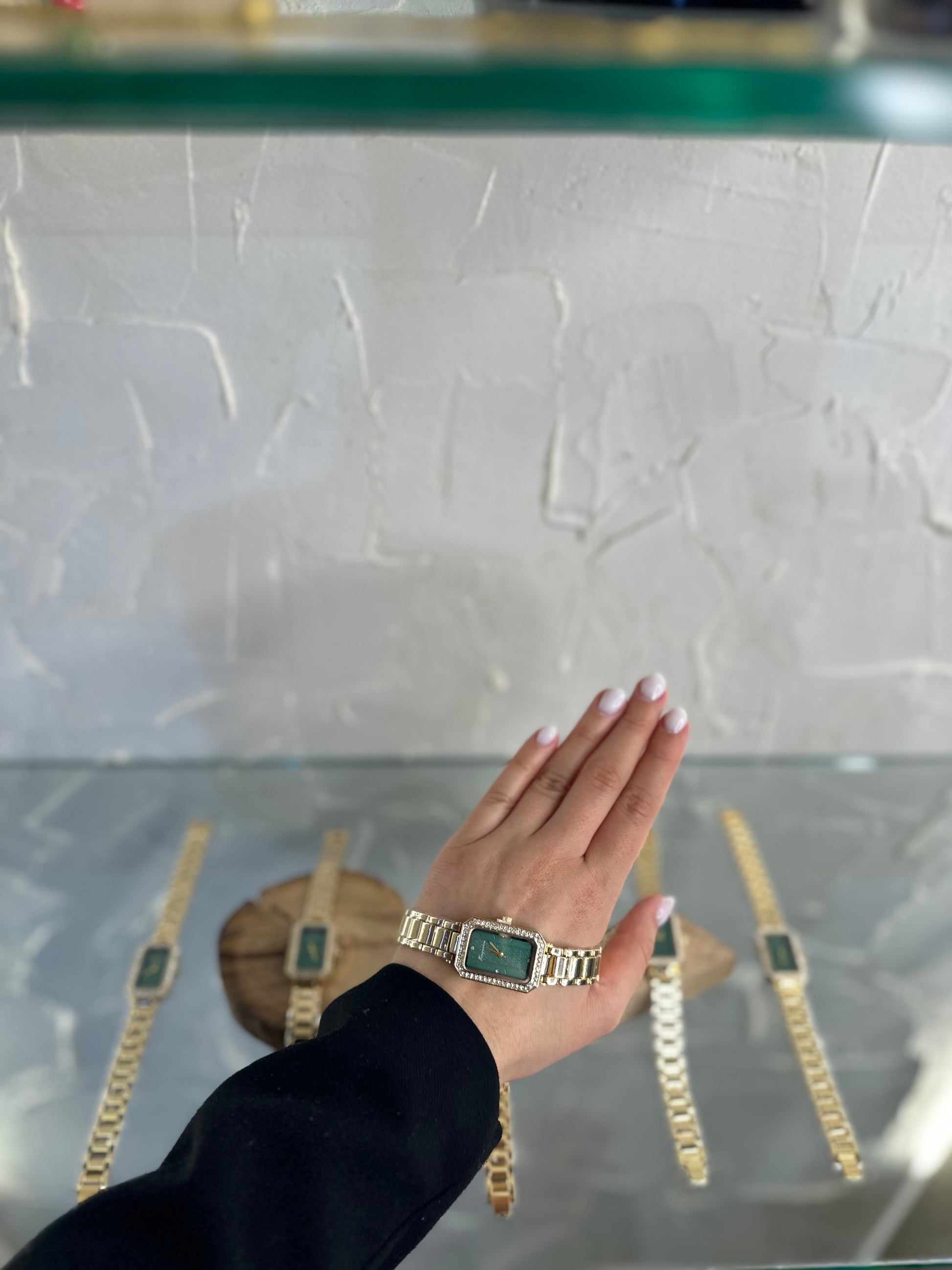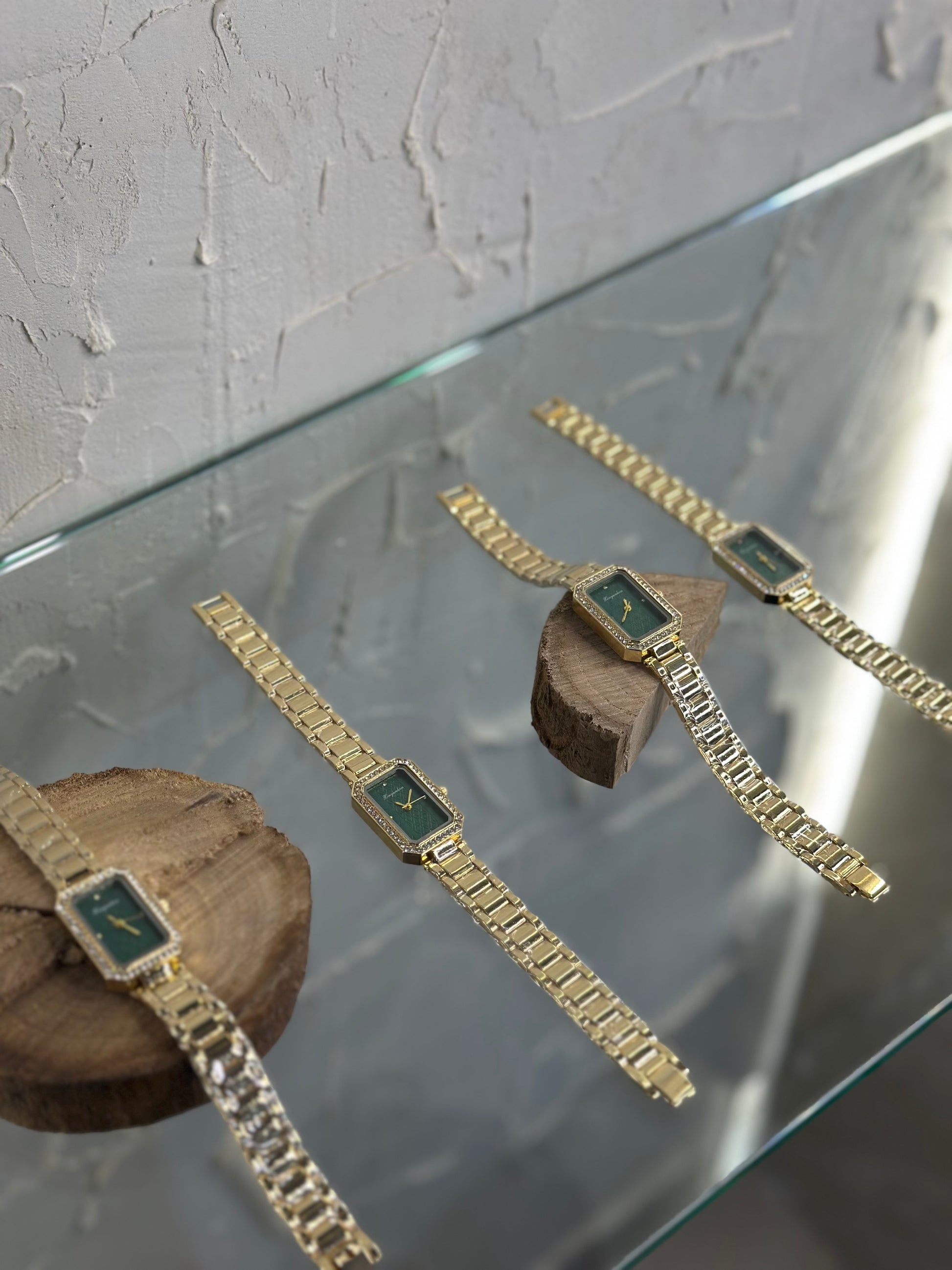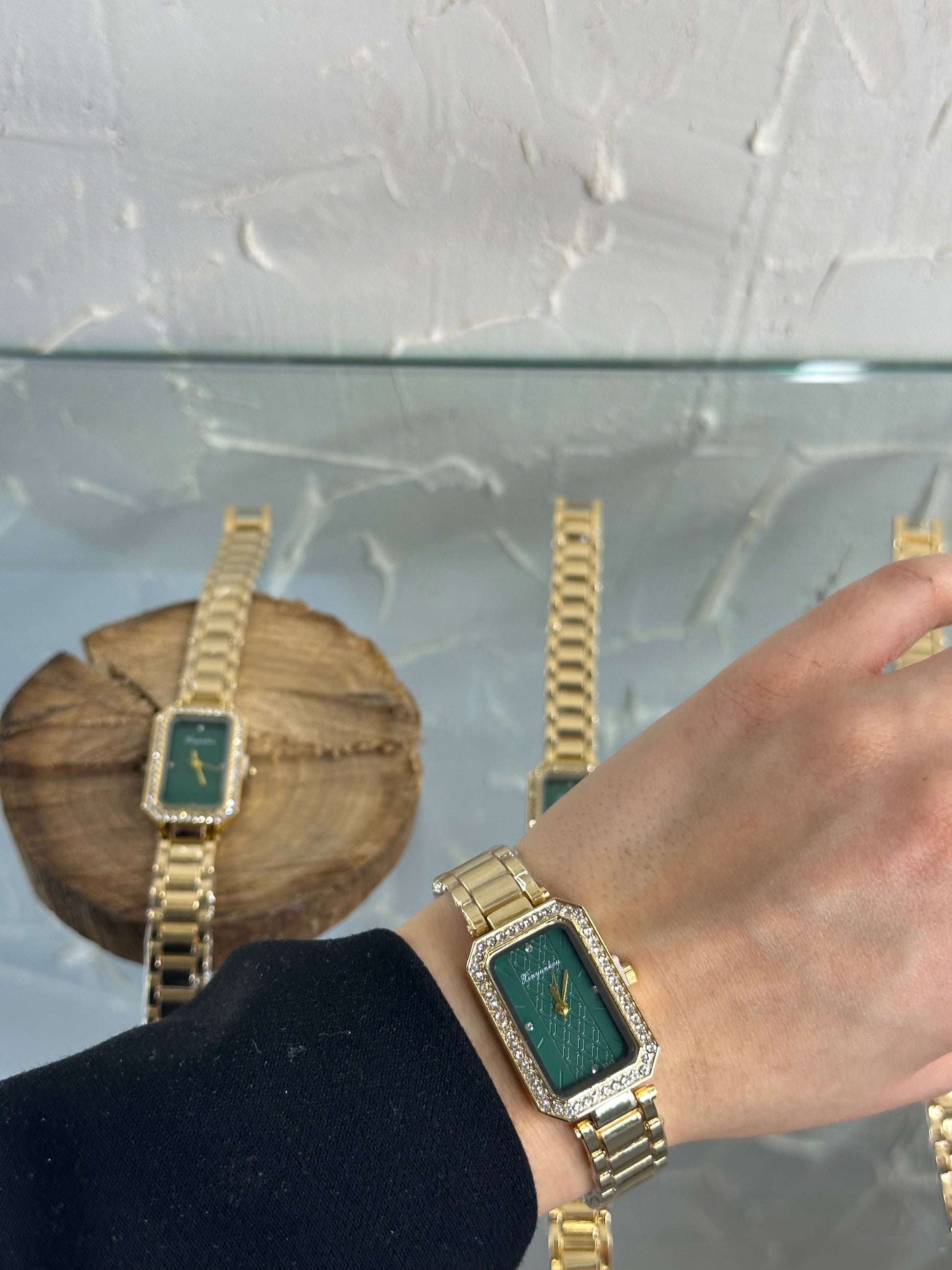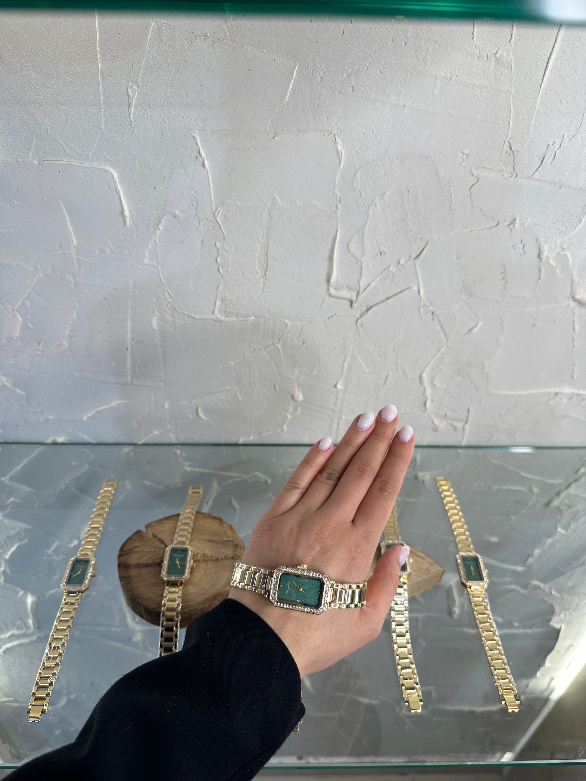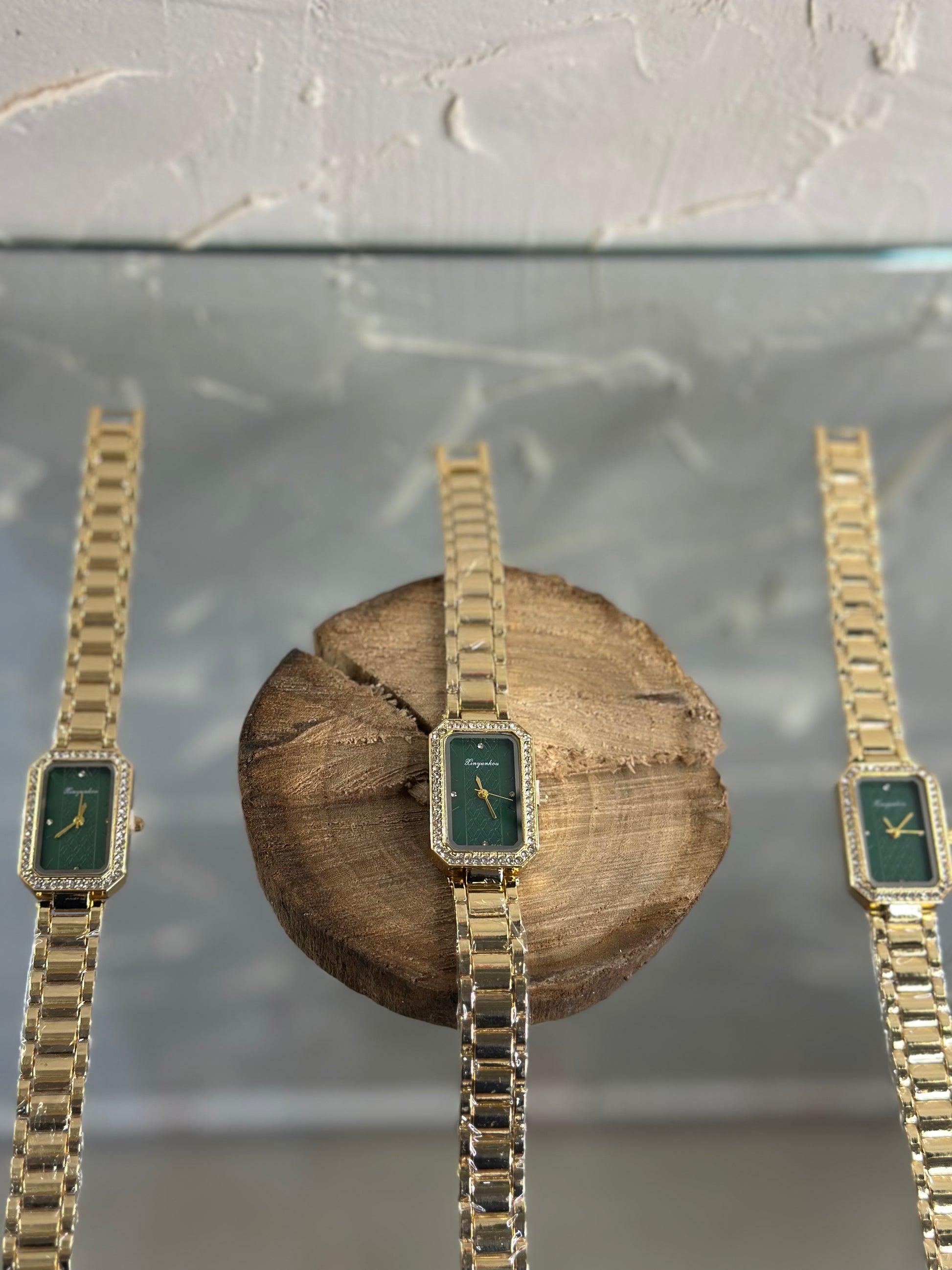 Γυναικείο Ρολόι με Πράσινο Ορθογώνιο Καντράν και Χρυσό Λουρί