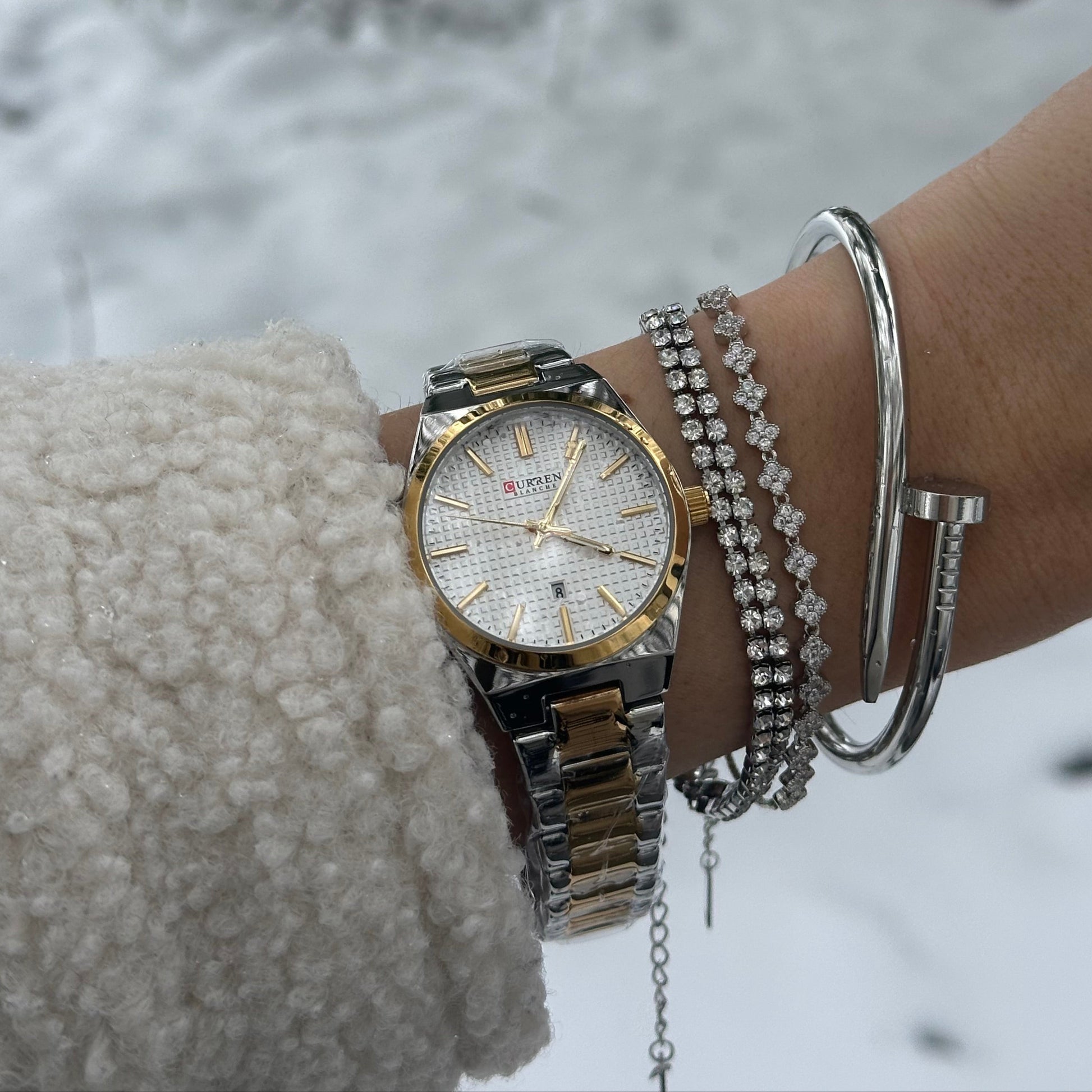 Ανακαλύψτε το ρολόι "Golden Mist" με άσπρο στρογγυλό καντράν και χρυσό με ασημί λουρί, που συνδυάζει ατσάλινη ανθεκτικότητα και εκλεπτυσμένο σχεδιασμό. Ιδανικό για κάθε περίσταση, προσαρμόζεται τέλεια στο προσωπικό σας στυλ. Αποκτήστε το σήμερα και προσθέστε μια αίσθηση κομψότητας και λάμψης στις εμφανίσεις σας! ✨