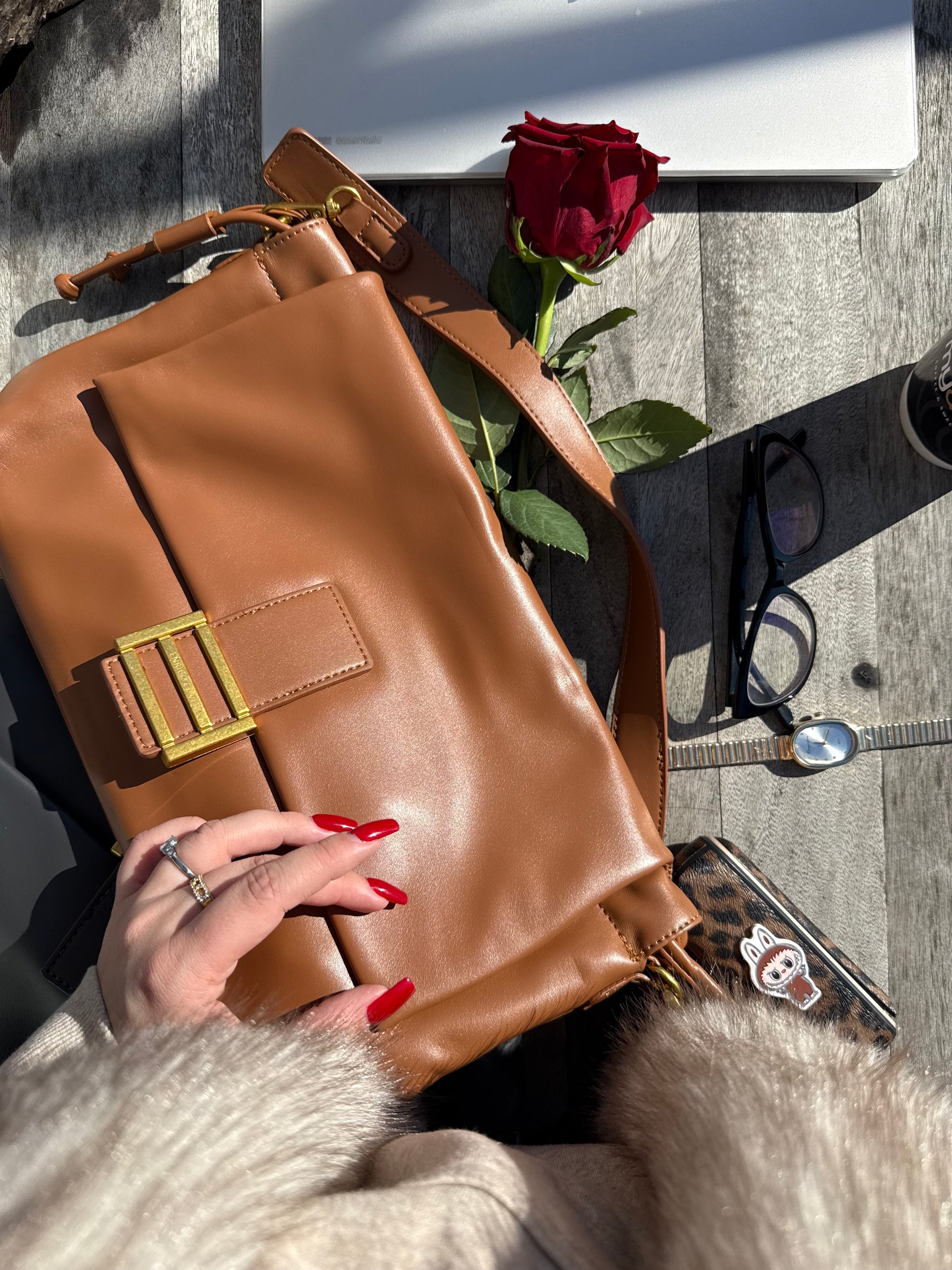 Απαλή υφή σε ζεστή camel απόχρωση, χρυσή αγκράφα που τραβάει το φως και γραμμές που αγκαλιάζουν το σώμα με φυσική αυτοπεποίθηση. Φοριέται κοντά, κρατιέται σφιχτά και συνοδεύει στιγμές που δεν χρειάζονται πολλά λόγια μόνο παρουσία.