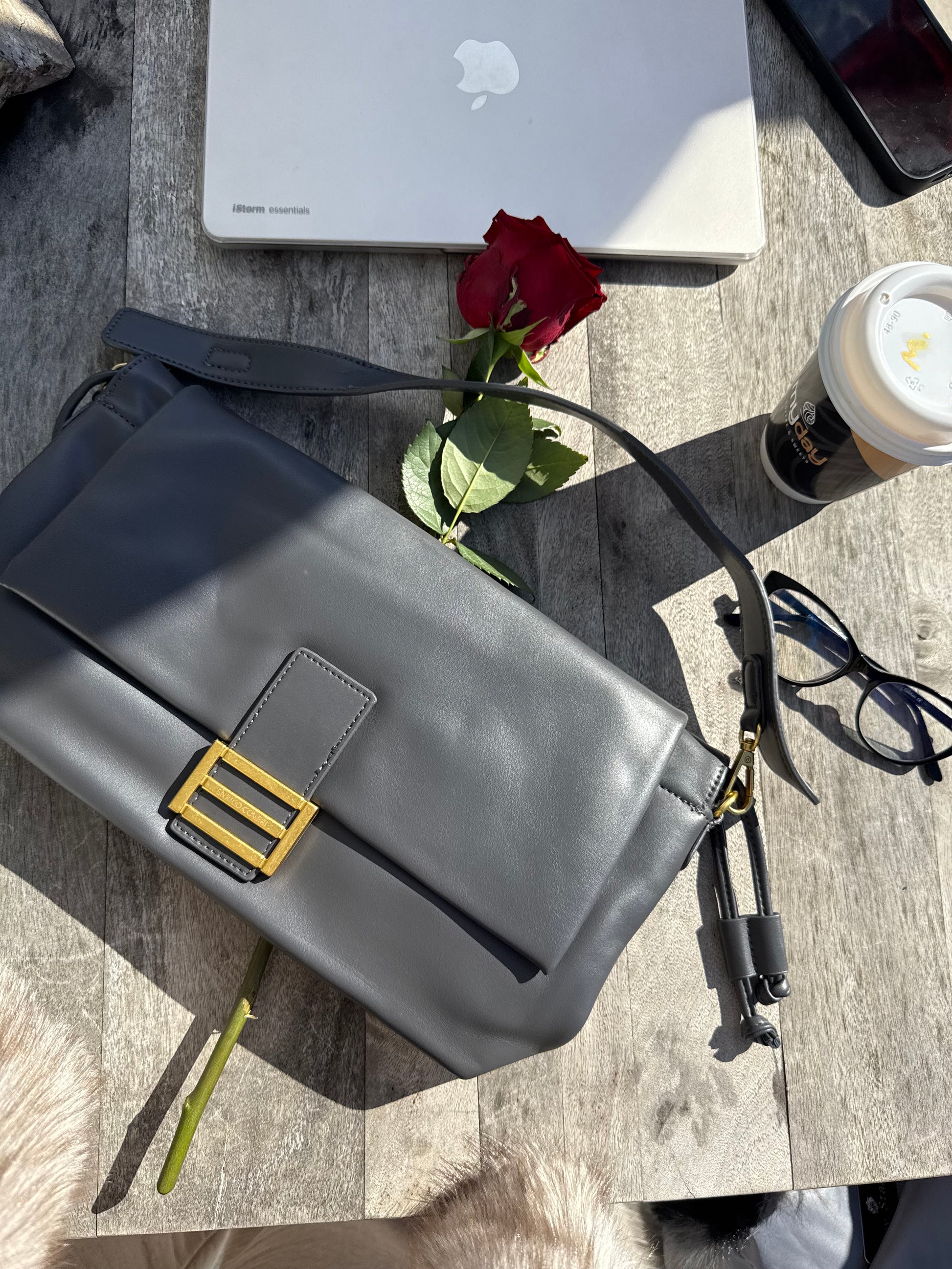 Ψυχρό γκρι, απαλή υφή και χρυσή λεπτομέρεια που κλειδώνει το βλέμμα. Μια τσάντα που δεν φωνάζει επιβάλλεται. Φοριέται κοντά στο σώμα, συνοδεύει βραδιές χωρίς πρόγραμμα και εμφανίσεις που δεν χρειάζονται εξηγήσεις.