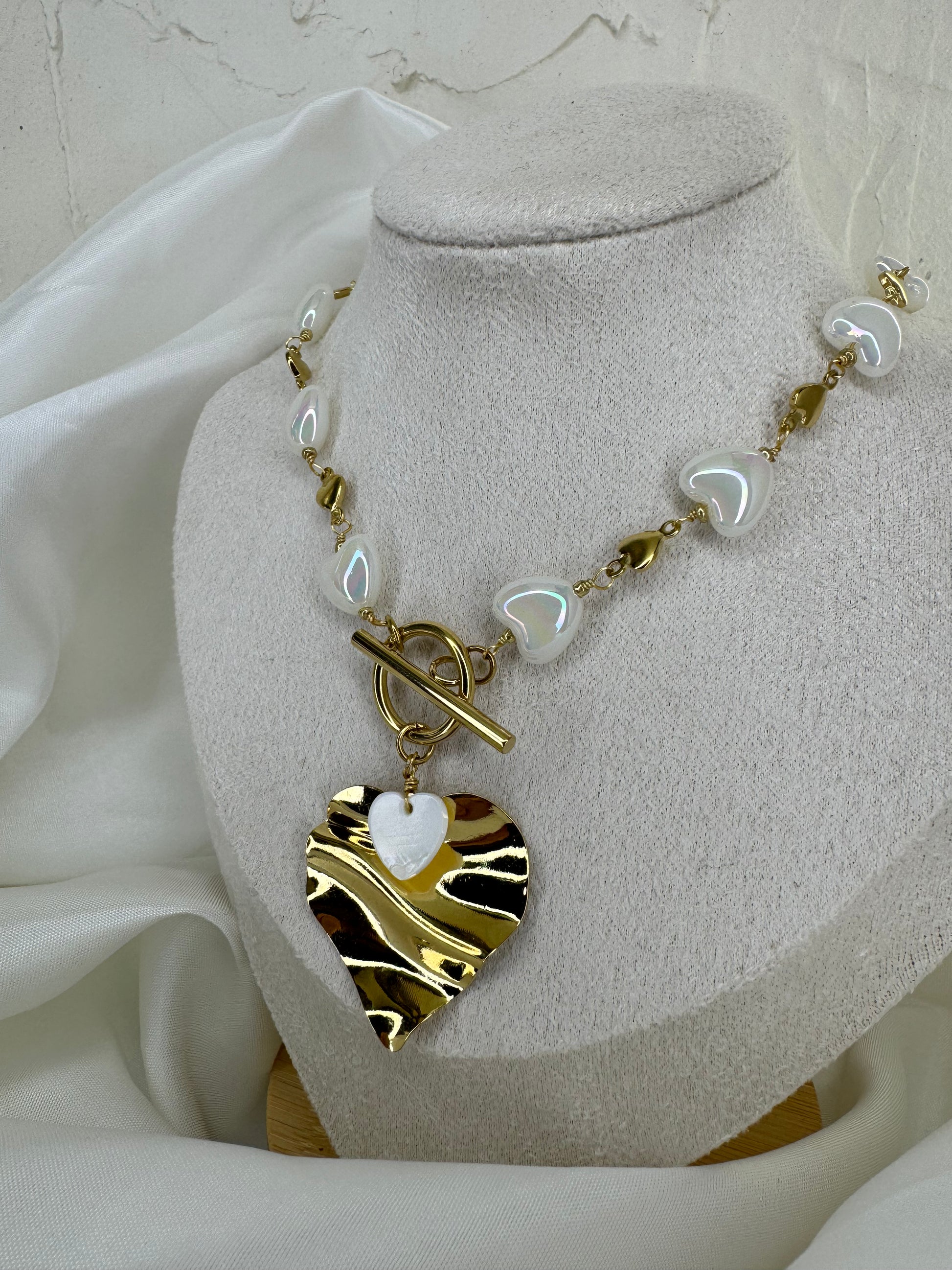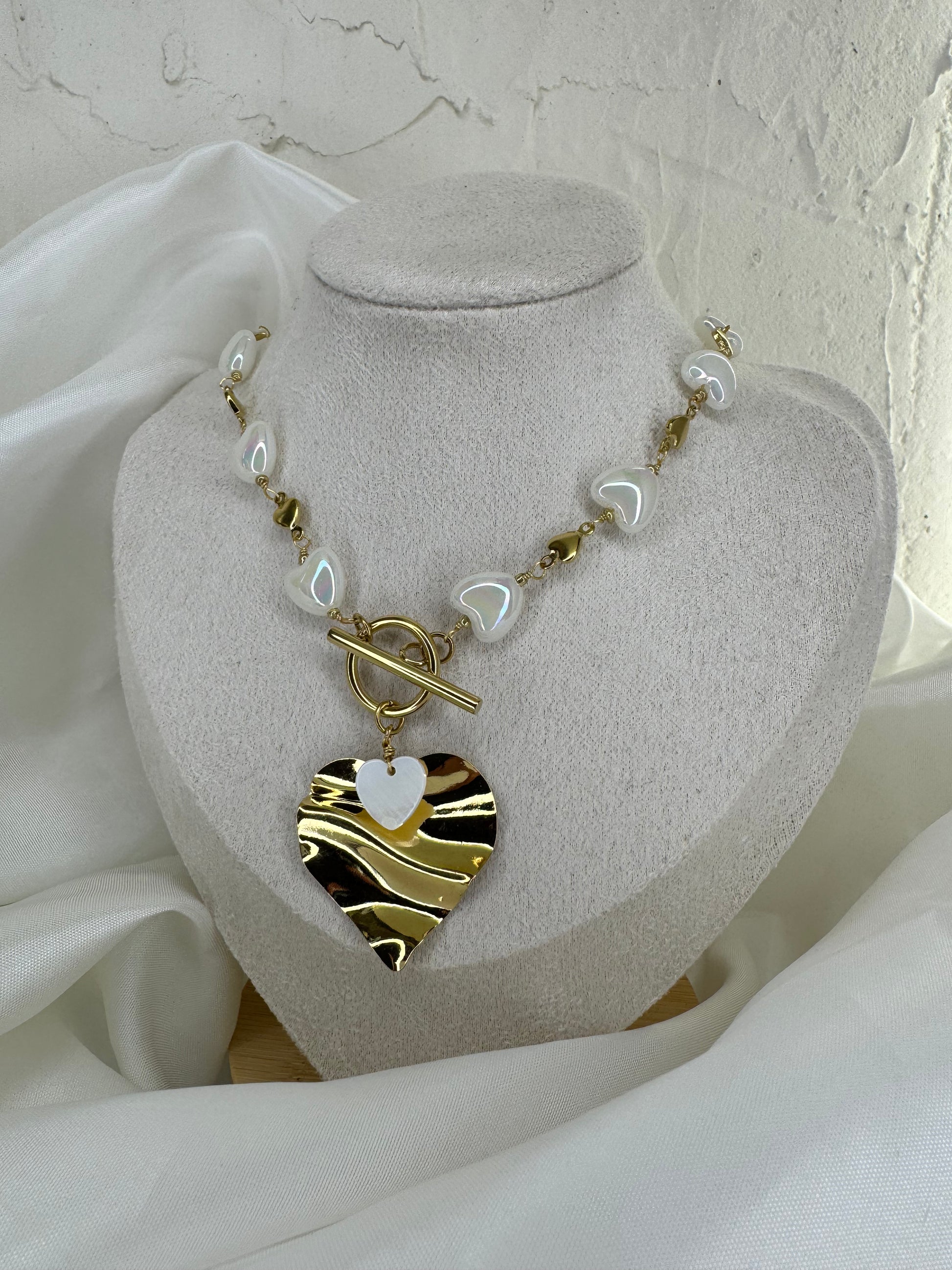 Ένα κολιέ που συνδυάζει ρομαντισμό και μοντέρνα αισθητική. Οι πέρλες σε σχήμα καρδιάς αγκαλιάζουν τον λαιμό με διακριτική λάμψη, ενώ στο κέντρο δεσπόζει το εντυπωσιακό κούμπωμα με διπλό μοτίφ: μία χρυσή, ανάγλυφη καρδιά που αποπνέει δυναμισμό και μπροστά της μία λευκή περλέ καρδιά που χαρίζει τρυφερότητα. Ένα κόσμημα-δήλωση που ισορροπεί ανάμεσα στην κομψότητα και τη μοναδικότητα.
