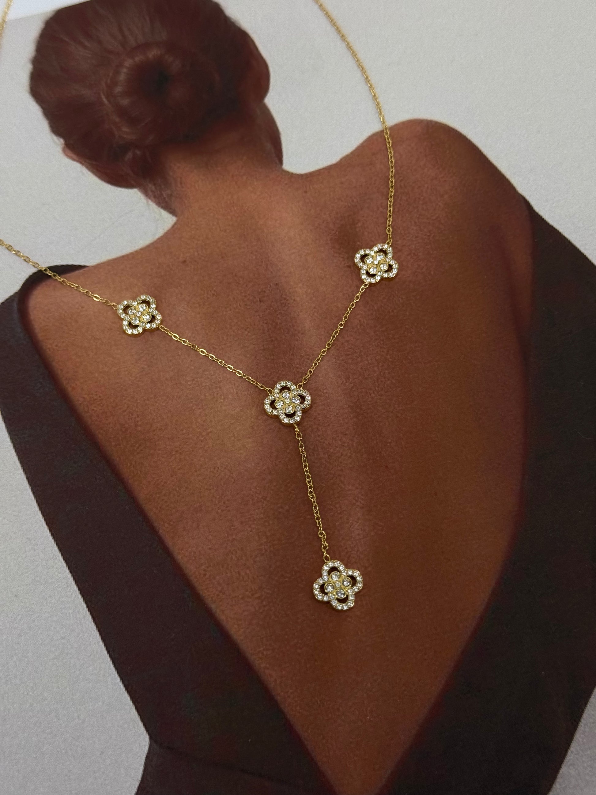 Ένα κολιέ που αποπνέει ρομαντισμό και διαχρονική κομψότητα. Η χρυσή αλυσίδα στολίζεται με λουλουδένια μοτίβα διακοσμημένα με λαμπερούς κρυστάλλους, σχηματίζοντας έναν μοναδικό σχεδιασμό που αναδεικνύειτο ντεκολτέ με κομψότητα. Ένα statement κόσμημα που μετατρέπει κάθε εμφάνιση σε κάτι ξεχωριστό.
