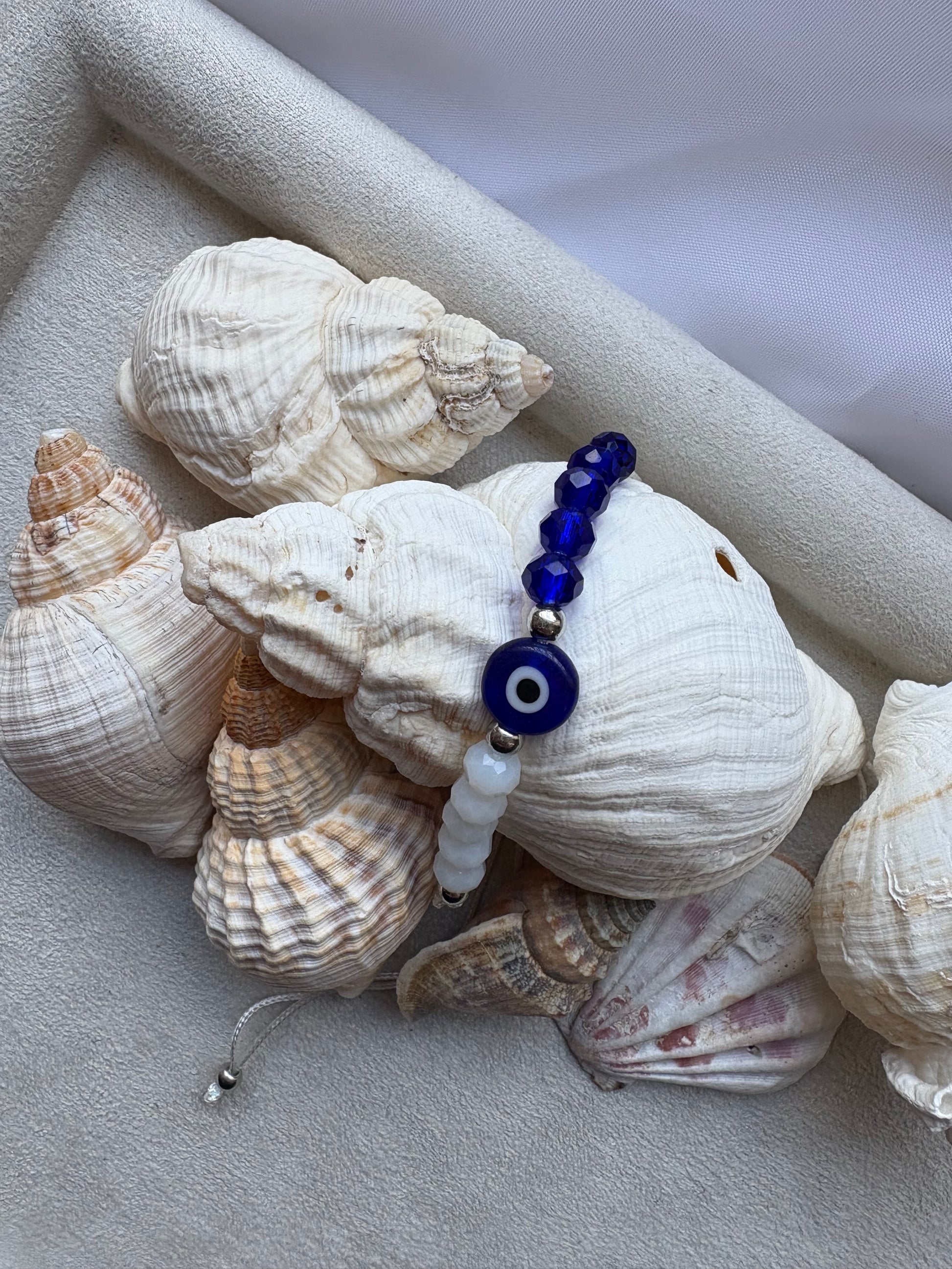 Ένα βραχιόλι σαν φυλαχτό του καλοκαιριού. Το έντονο μπλε του ματιού συνδυάζεται με διαφανείς και κρυστάλλινες χάντρες σε μια minimal σύνθεση που τραβά τα βλέμματα και απωθεί την αρνητική ενέργεια.