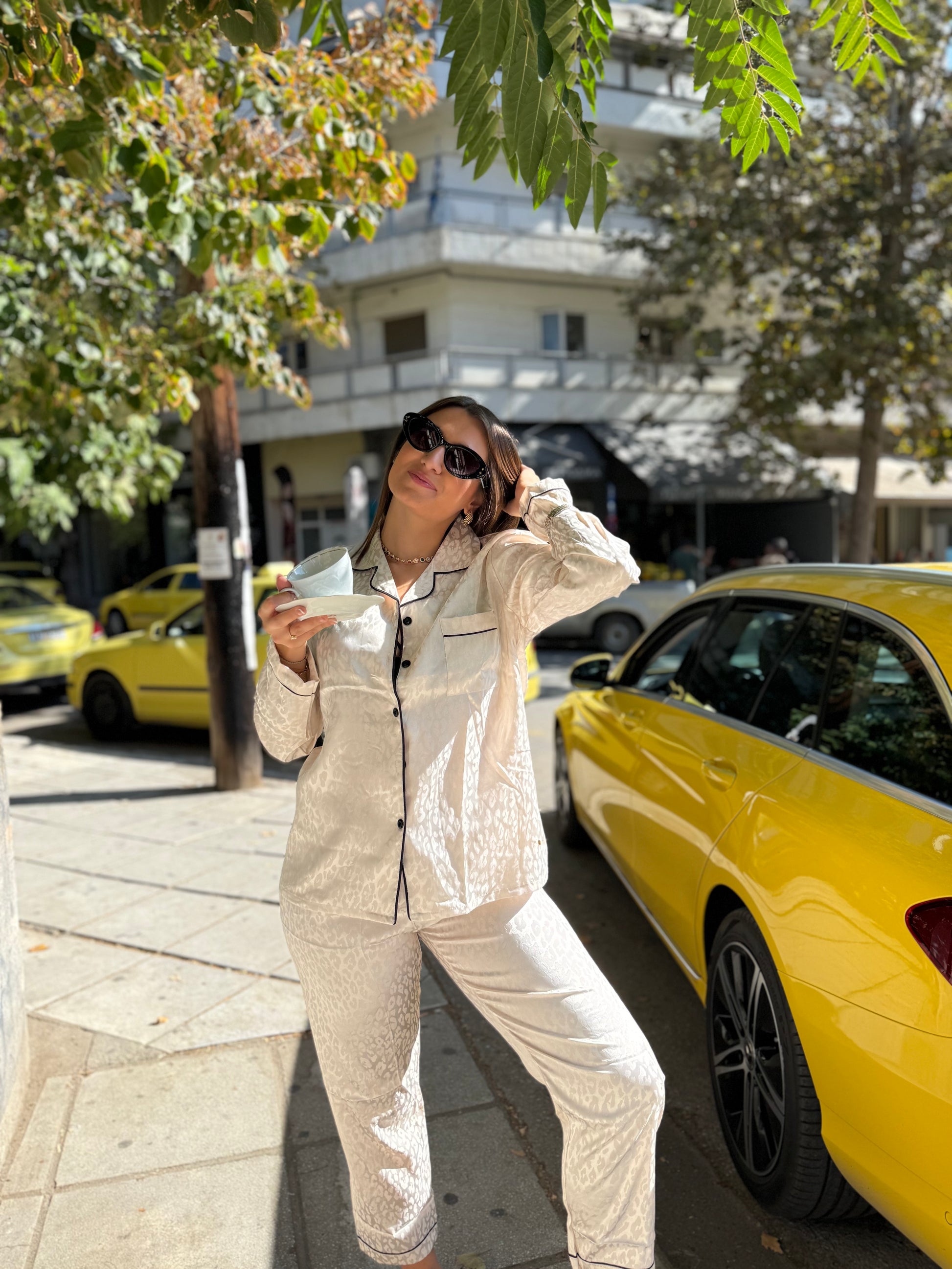 - 🪞 Ύφασμα: Σατέν με απαλή λάμψη και διακριτικό animal-print μοτίβο