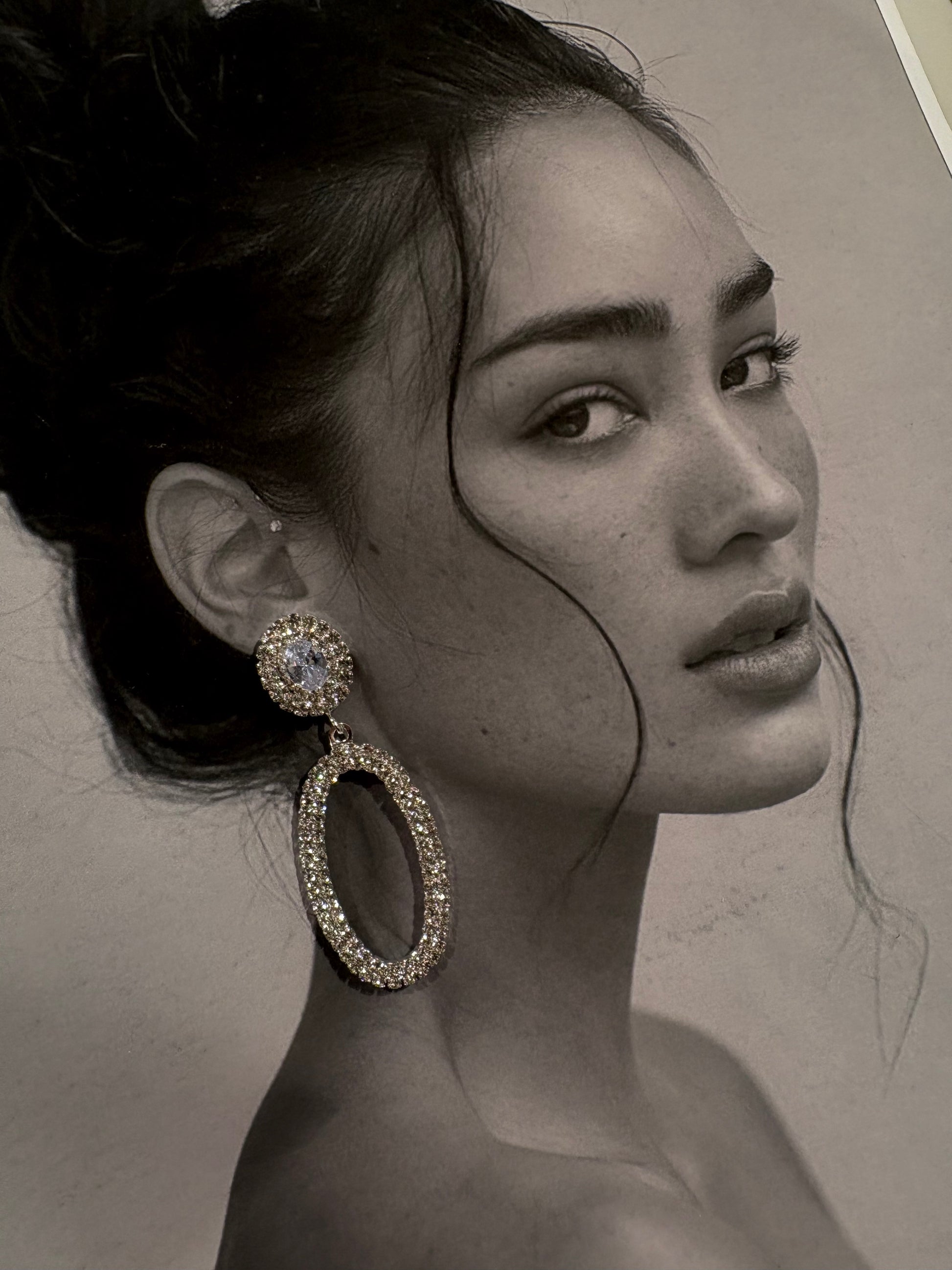 Ο μεγάλος οβάλ κρίκος, στολισμένος με δεκάδες λαμπερές πέτρες, δημιουργεί ένα οπτικό narrative υψηλής αισθητικής, ενώ το άνω μέρος με την κρυστάλλινη λάμψη λειτουργεί σαν φωτεινός κόμβος μια μικρή “παρουσίαση δωματίου” κάθε φορά που γυρνά το κεφάλι.