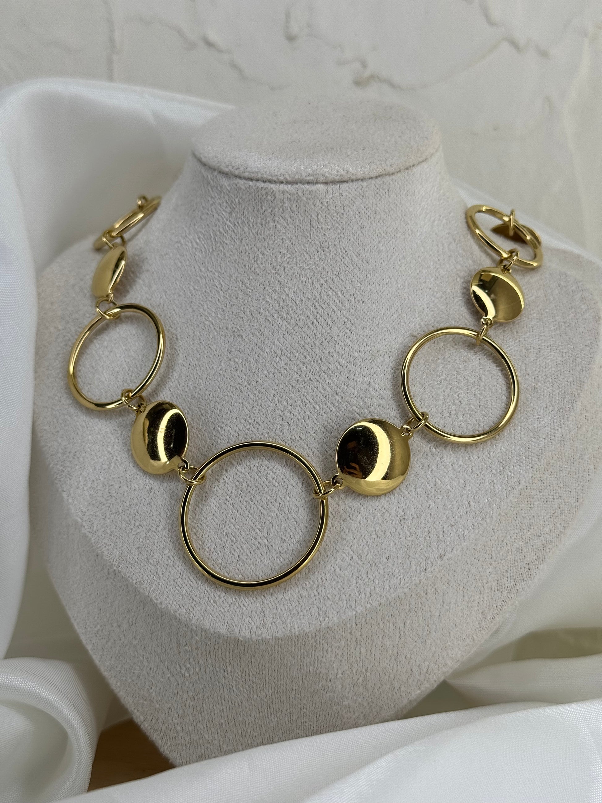 Ένα κολιέ που ενώνει τη μίνιμαλ αισθητική με τη διαχρονική κομψότητα. Οι χρυσοί κρίκοι δημιουργούν μία αρμονική αλυσίδα που αγκαλιάζει το ντεκολτέ με διακριτική λάμψη. Ένα απαραίτητο κόσμημα-βάση για layering, αλλά και statement επιλογή όταν φορεθεί μόνο του.