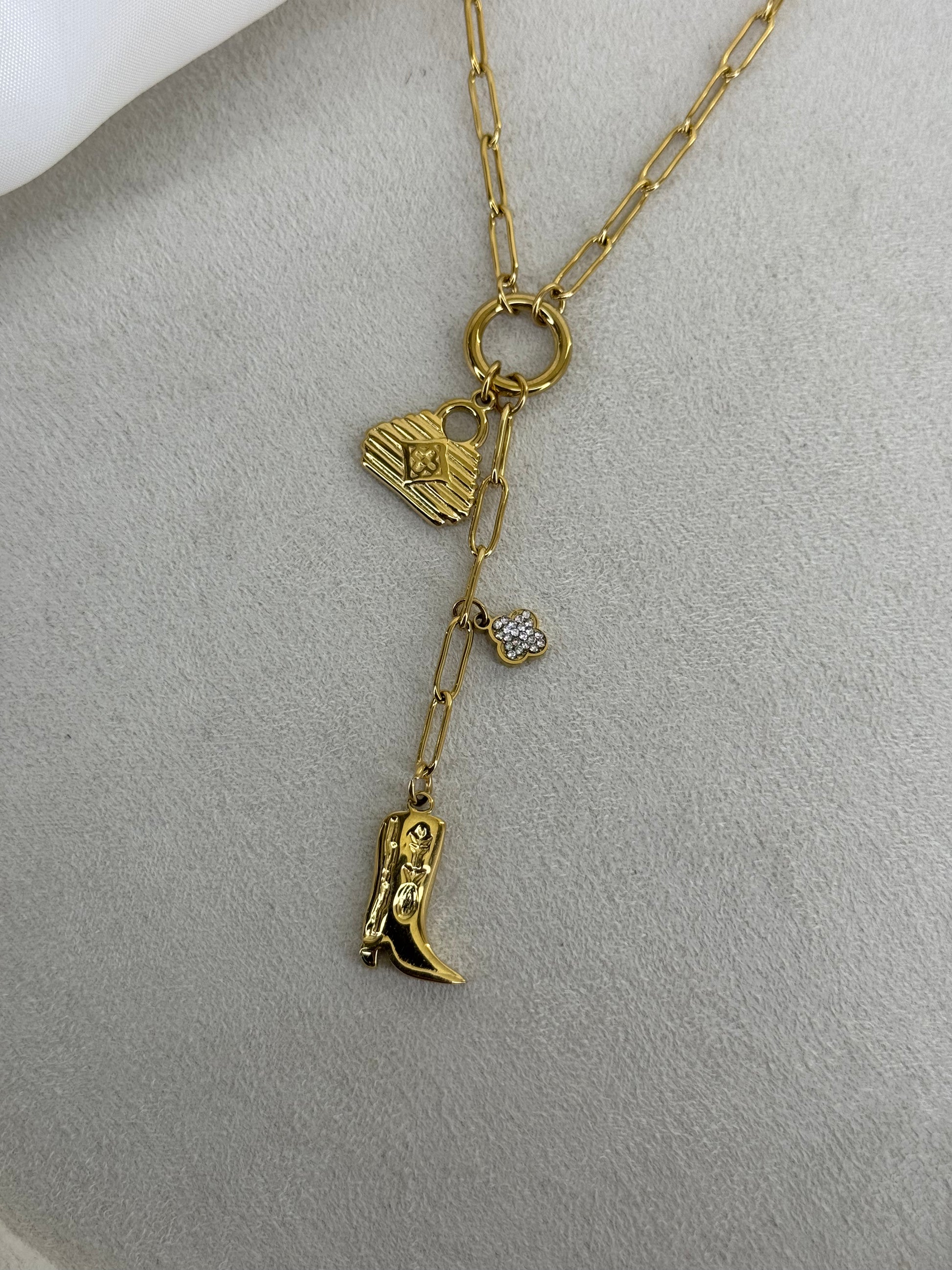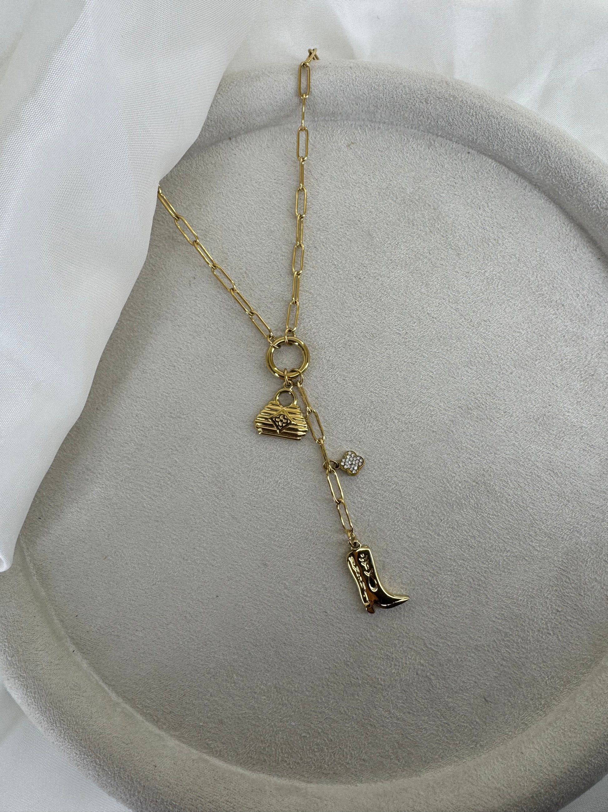 Ένα κολιέ που συνδυάζει τη δυναμική αισθητική με παιχνιδιάρικες λεπτομέρειες. Η χρυσή αλυσίδα καταλήγει μπροστά σε “tie effect” σχέδιο, όπου κρέμονται τρία μοναδικά charms. Ένα ιδιαίτερο κόσμημα που απογειώνει το στυλ με fashion και glam διάθεση.