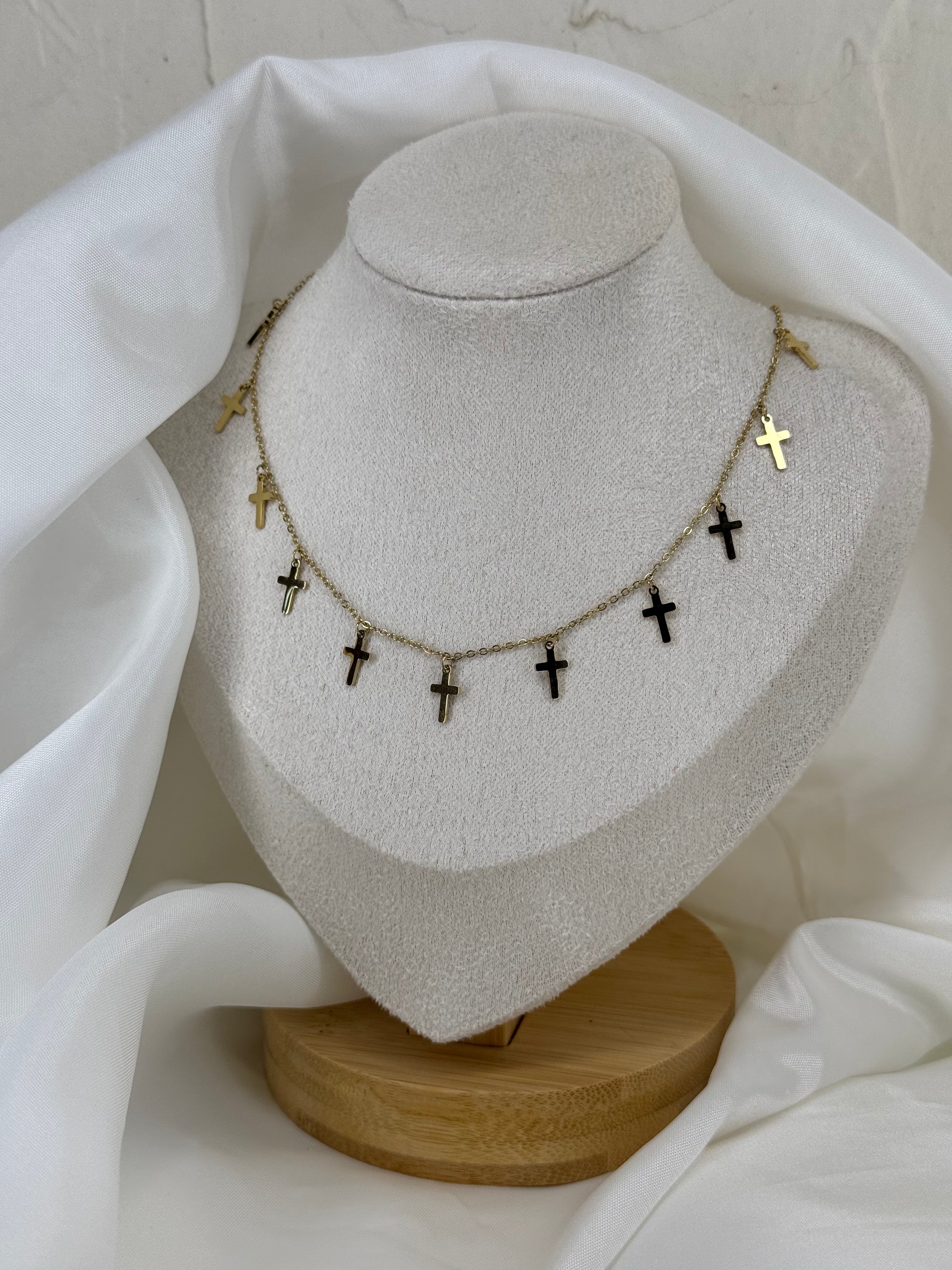 Ένα διακριτικό αλλά εντυπωσιακό κολιέ που συνδυάζει απλότητα με συμβολισμό. Η λεπτή χρυσή αλυσίδα στολίζεται με μικρά charms σε σχήμα σταυρού, δημιουργώντας ένα κόσμημα που αποπνέει κομψότητα και πνευματική δύναμη. Ιδανικό για layering ή για να φορεθεί μόνο του ως statement κομμάτι.