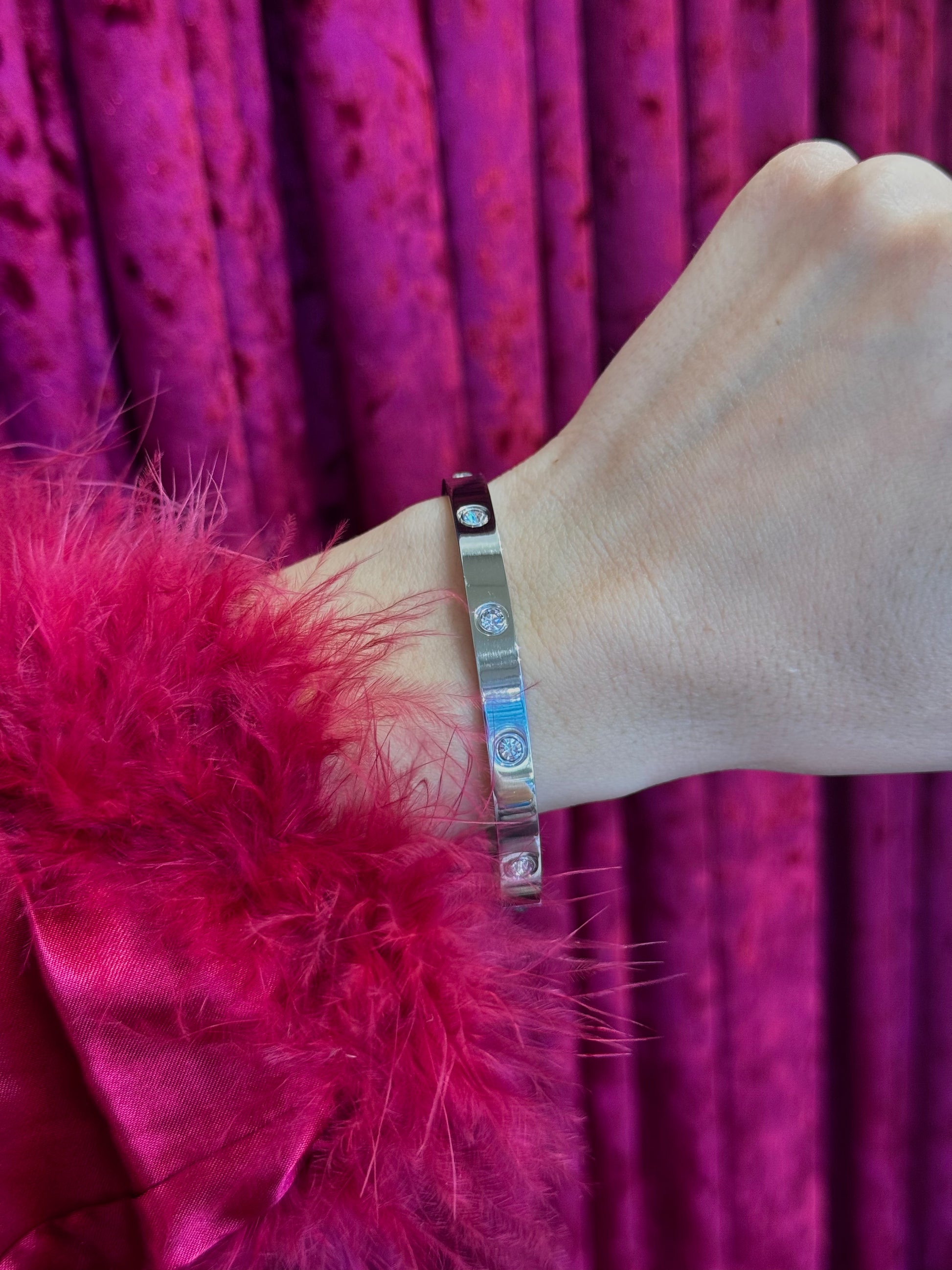 Λεπτή χειροπέδα σε ασημί τόνο με διακριτικές πέτρες τύπου “dot” που προσθέτουν καθαρή λάμψη χωρίς υπερβολές. Είναι το απόλυτο everyday piece, δουλεύει τέλεια μόνη της και κάνει seamless match με layering.