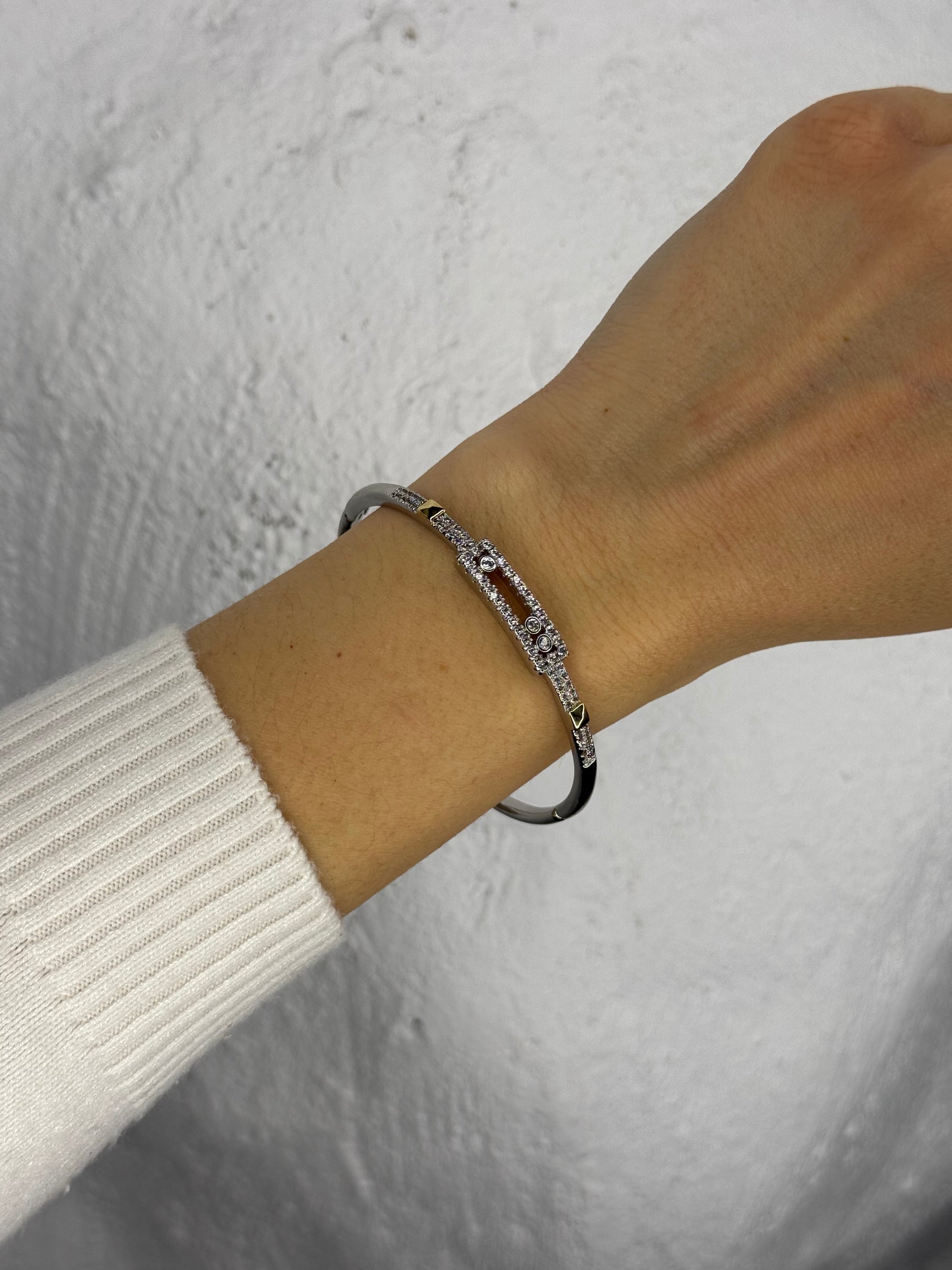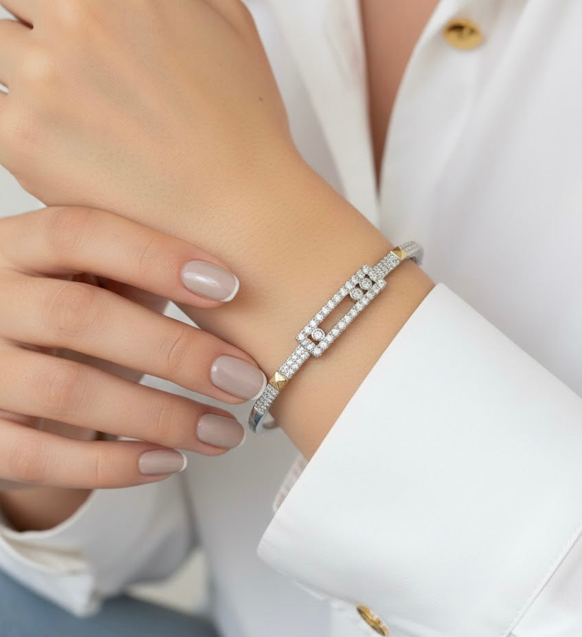 Μια χειροπέδα που χαράζει μια καθαρή, φωτεινή γραμμή πάνω στον καρπό. Η διπλή σειρά από κρυστάλλους και οι χρυσές λεπτομέρειες δημιουργούν ένα refined αποτέλεσμα που αποπνέει διακριτική πολυτέλεια. Είναι το κόσμημα που “μιλάει” χαμηλόφωνα αλλά ξεκάθαρα, αυστηρή κομψότητα, premium αισθητική, zero effort.