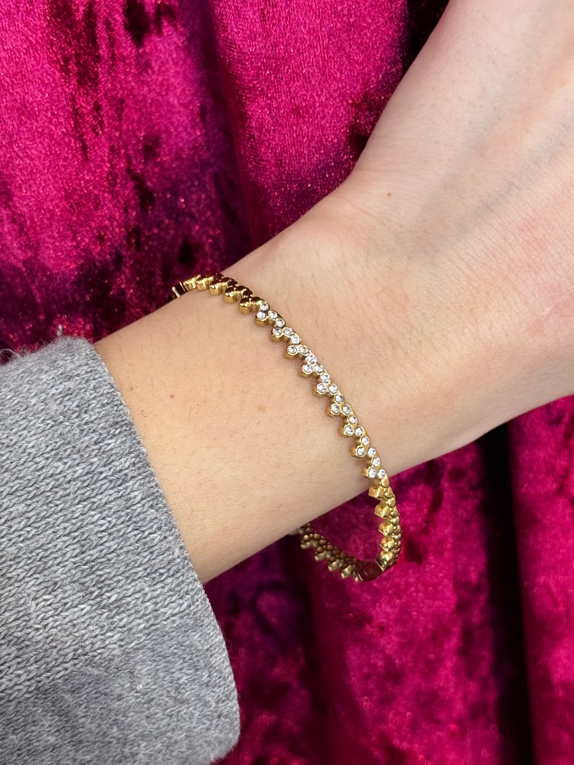 Η επιτομή της φινέτσας σε ένα κόσμημα που δεν θα θέλετε να αποχωριστείτε. Η χειροπέδα είναι φιλοτεχνημένη από stainless steel σε χρυσή απόχρωση, στολισμένη με μια συνεχή σειρά από αστραφτερά κρύσταλλα ζιργκόν που δημιουργούν ένα μονοπάτι λάμψης στον καρπό σας. Ένα άκρως θηλυκό και διαχρονικό κομμάτι, ιδανικό για να προσθέσει μια δόση "glam" στις καθημερινές σας στιγμές ή να ολοκληρώσει μια επίσημη εμφάνιση με την απαραίτητη κομψότητα.