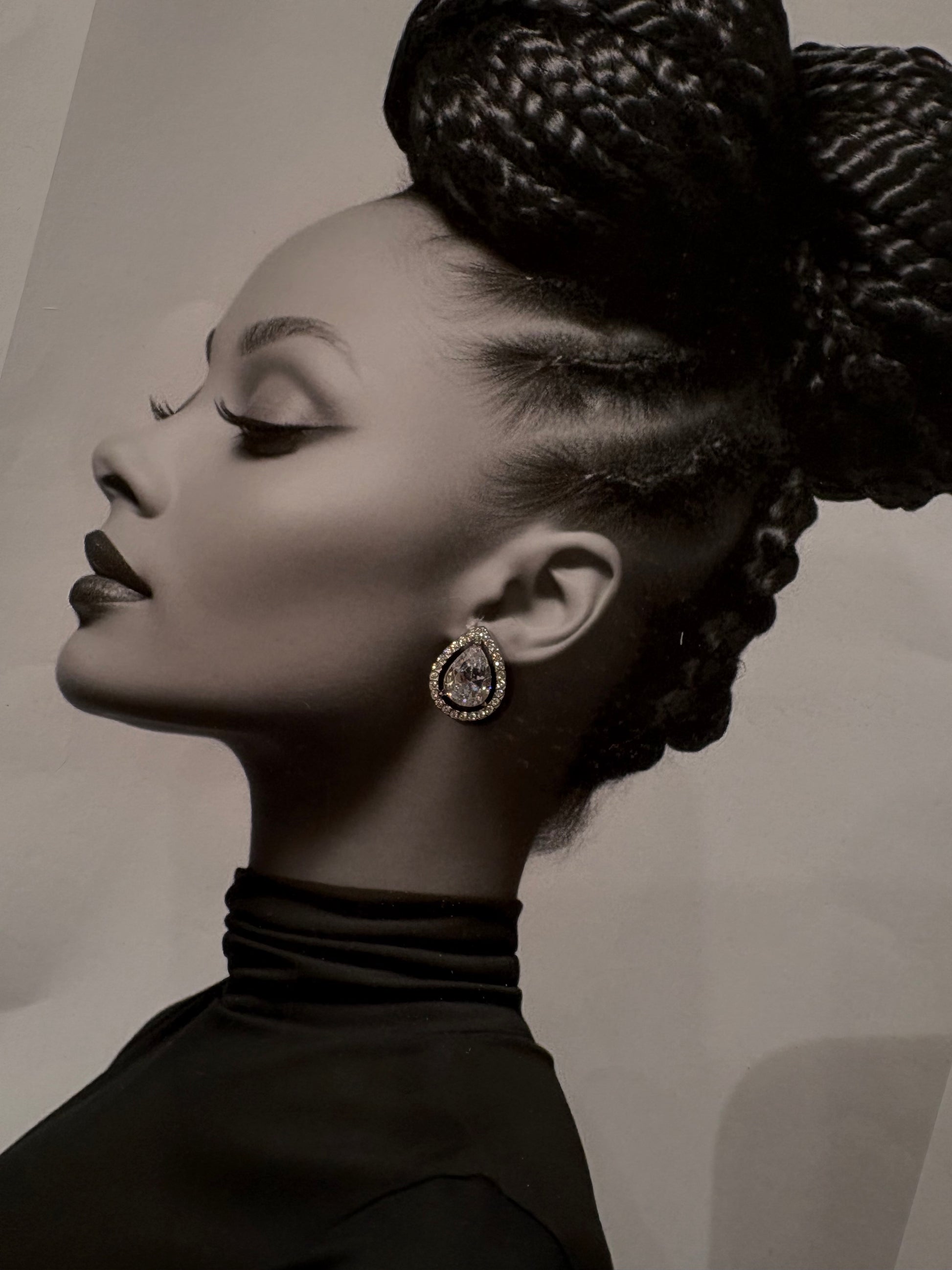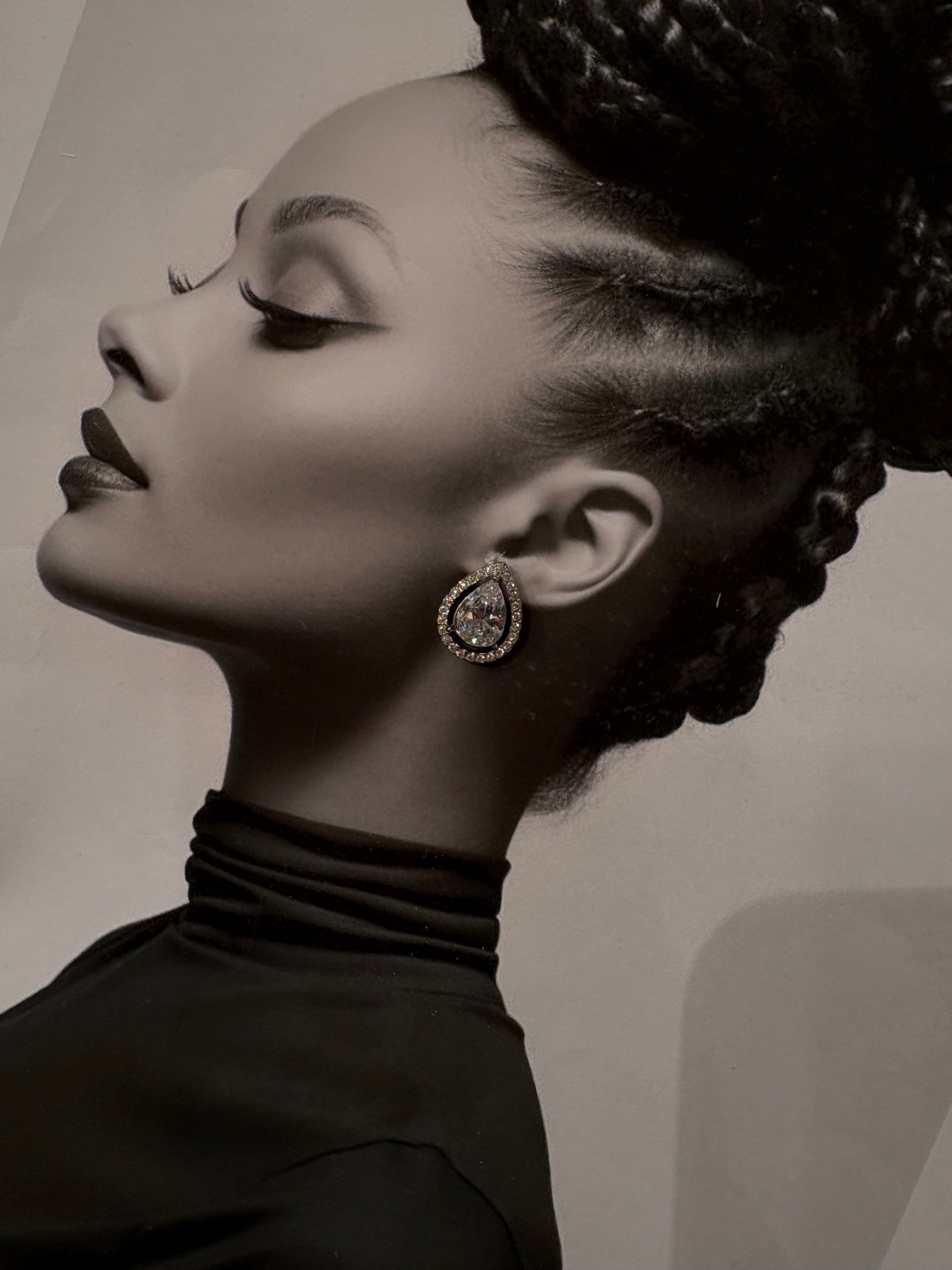 Ένα πολυτελές σκουλαρίκι σε δακρυόσχημο σχεδιασμό, με λαμπερή κεντρική πέτρα και περιμετρική σειρά από κρυστάλλους που φωτίζουν το πρόσωπο με κάθε κίνηση.