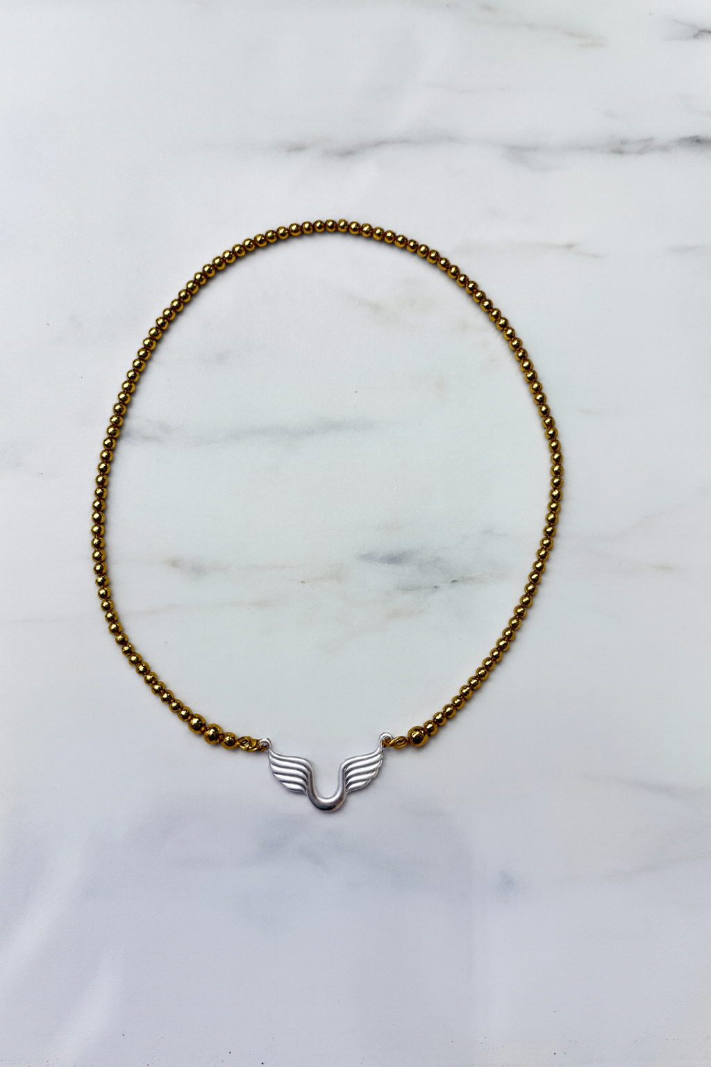 Ατσάλινο κολιέ με χρυσές χάντρες και ασημί φτερωτό στοιχείο, εμπνευσμένο από τη σκοτεινή, ακαταμάχητη ενέργεια του Damon. Ένα statement piece που αποπνέει δυναμισμό, μυστήριο και sleek αισθητική, ιδανικό για bold looks που δεν φοβούνται το spotlight του Mystic Falls.