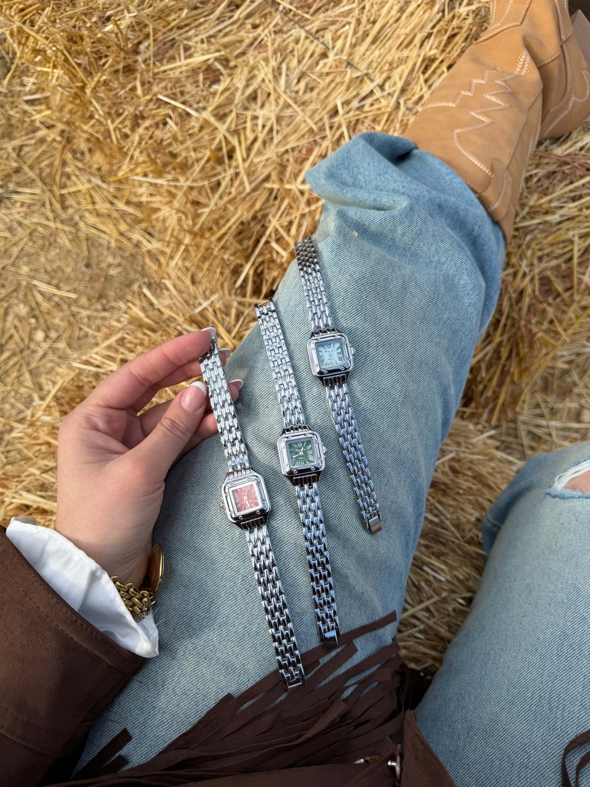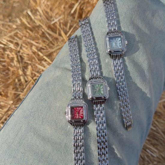 Η σειρά Daphne επαναφέρει το κλασικό τετράγωνο σχήμα με μια σύγχρονη, girly ματιά. Με φίνο μπρασελέ από μstainless steel και καντράν σε τρεις μοναδικές αποχρώσεις —το παθιασμένο κόκκινο, το βαθύ πράσινο και το γαλάζιο— είναι το αξεσουάρ που θα γίνει η αγαπημένη σας καθημερινή συνήθεια.