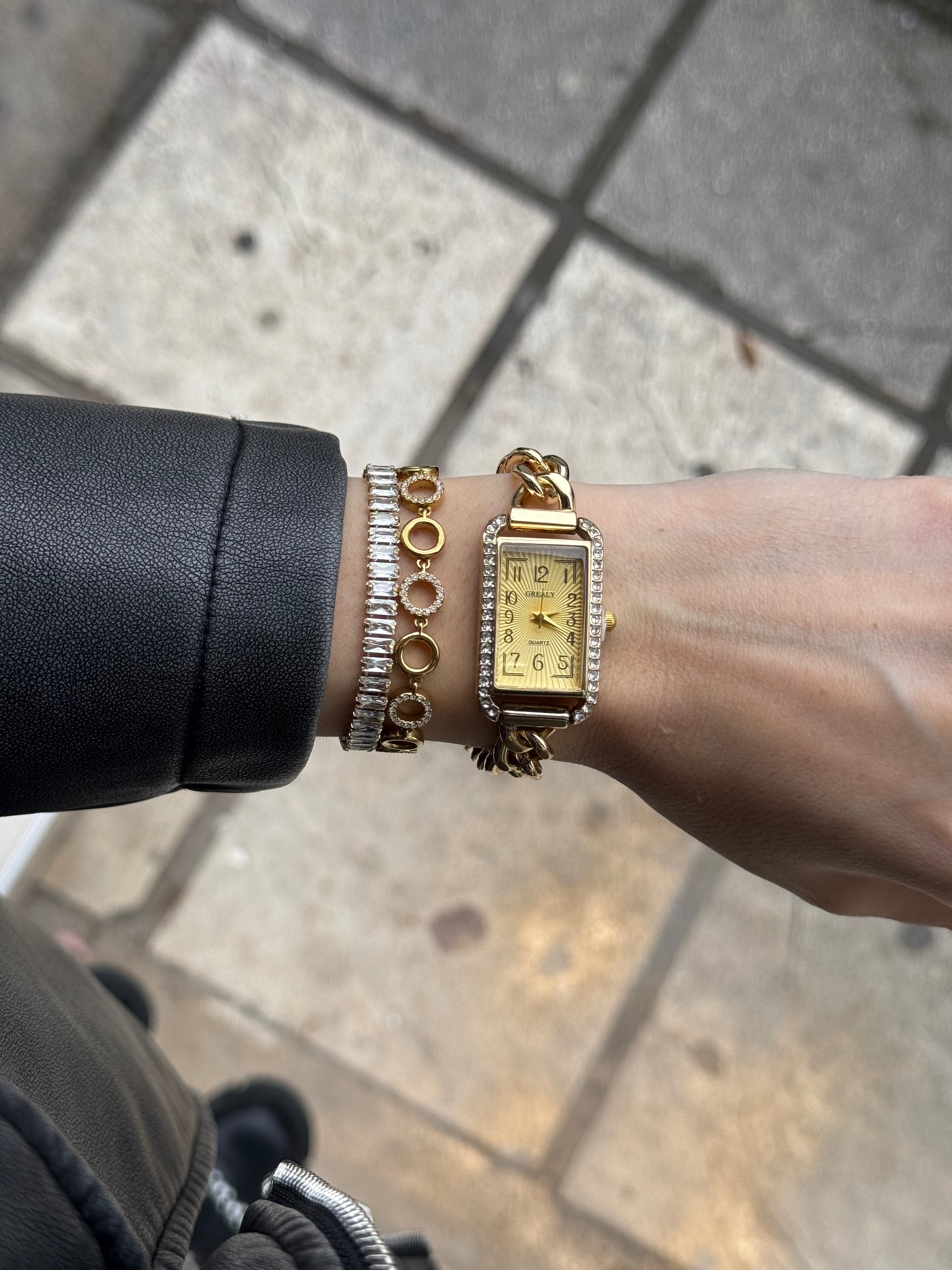 ΤοDeco Muse είναι ένα ρολόι που ενώνει τη γοητεία των παλιών κοσμηματοπωλείων με τη σύγχρονη εταιρική αισθητική. Η ορθογώνια κάσα, περικλεισμένη από κρυστάλλους, συναντά το χρυσό chain-bracelet, δημιουργώντας ένα statement κομμάτι που φορτίζει τον καρπό με πολυτέλεια και αυτοπεποίθηση. Ένα ρολόι-υπογραφή για όσες κινούνται με στρατηγική λάμψη.