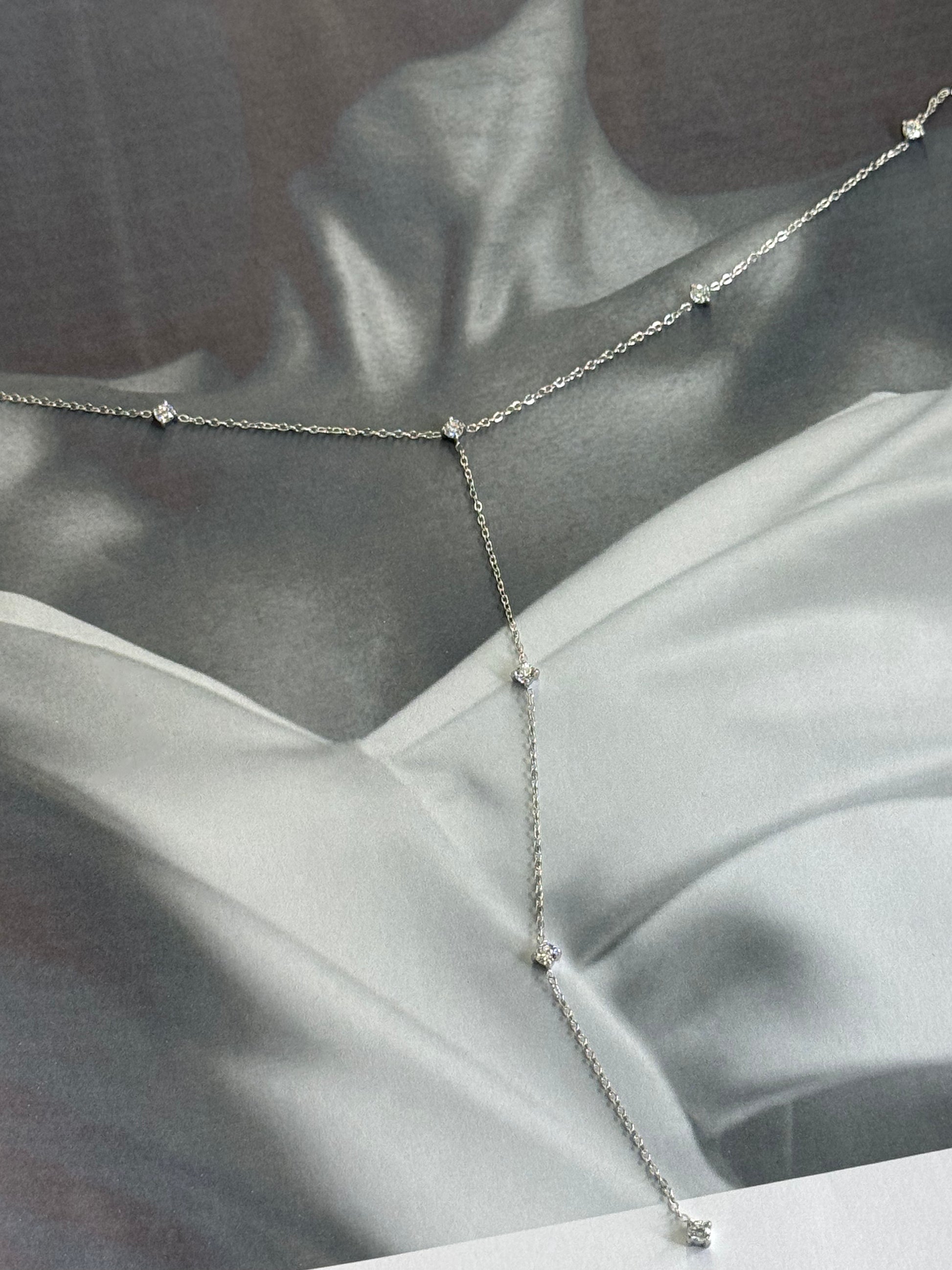 Ένα εκλεπτυσμένο κολιέ που ακολουθεί τη γραμμή του σώματος με διακριτική λάμψη. Η ασημί αλυσίδα στολίζεται με μικρούς λαμπερούς λίθους zircon, δημιουργώντας ένα εντυπωσιακό αποτέλεσμα που μπορεί να φορεθεί τόσο σε βραδινές εμφανίσεις όσο και σε minimal chic looks.