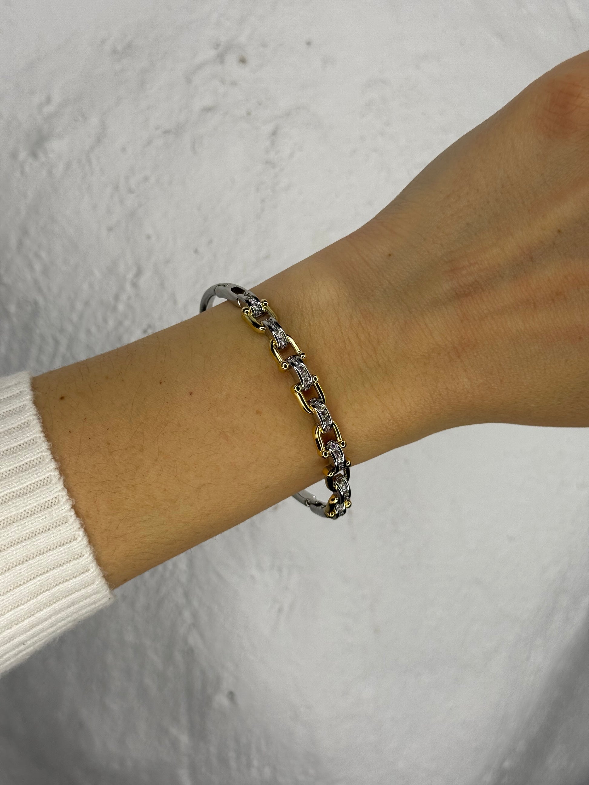 Μια χειροπέδα που χτίζει έναν διάλογο ανάμεσα στο ασημί και το χρυσό. Οι μικροί, αρθρωτοί κρίκοι με τις διακριτικές πέτρες δημιουργούν μια αρχιτεκτονική λάμψη, λεπτή, δυναμική, απόλυτα premium. Ένα κόσμημα που “γράφει” στον καρπό με καθαρότητα και κύρος, ιδανικό για layered looks αλλά και για solo εμφάνιση υψηλής αισθητικής.