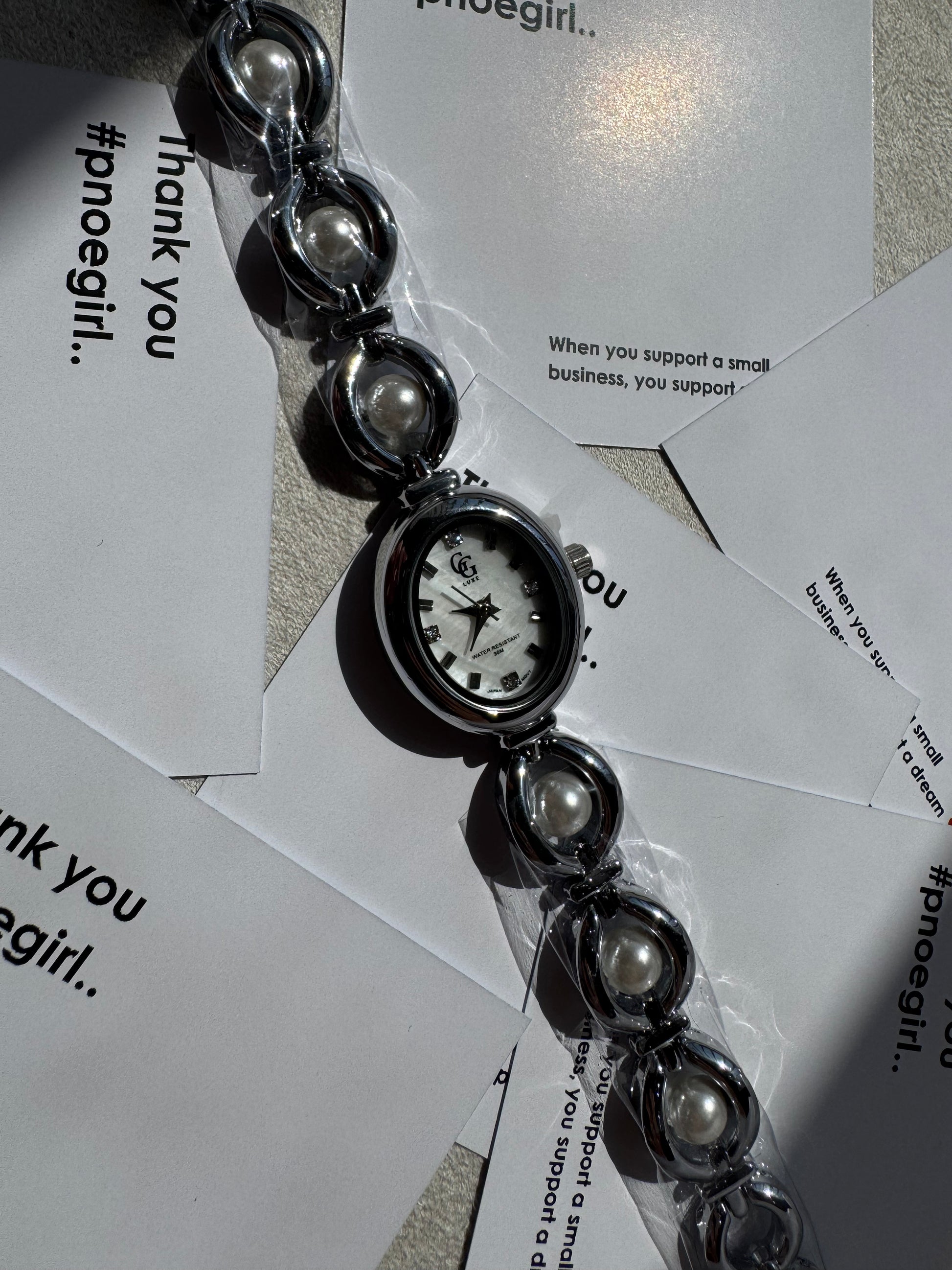 Το Éclat Argent συνδυάζει κομψότητα και διαχρονική φινέτσα. Το οβάλ λευκό καντράν του, διακοσμημένο με λαμπερά στρασάκια τραβάει τα βλέμματα με διακριτική λάμψη, ενώ το ασημί λουρί του, στολισμένο με πέρλες, χαρίζει μια ρομαντική και κομψή νότα στον καρπό.