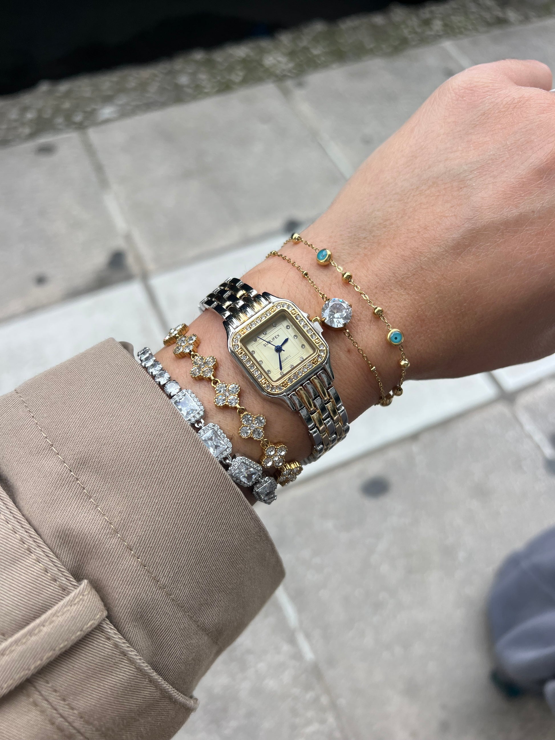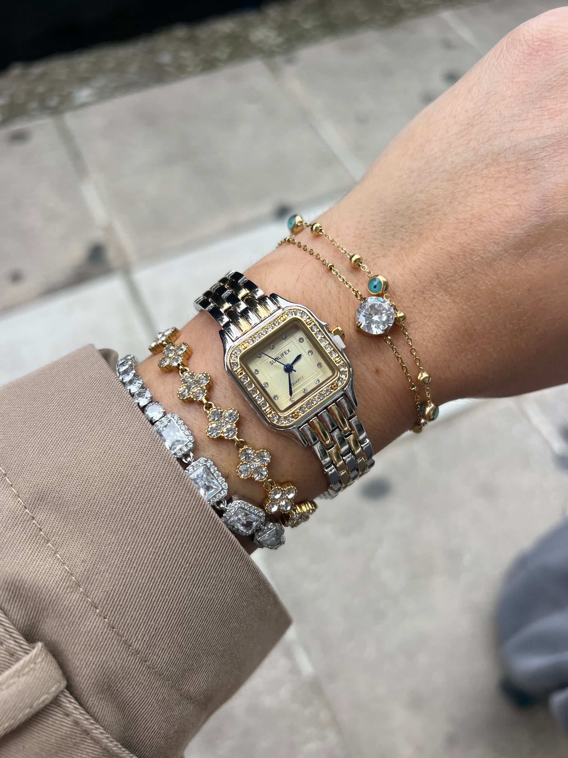 Το Éclat Doré είναι η επιτομή της διακριτικής πολυτέλειας. Με τον εκλεπτυσμένο συνδυασμό χρυσού και ασημί στο μπρασελέ του και το λαμπερό του πλαίσιο, αποπνέει θηλυκότητα και διαχρονικό στυλ. Η premium κατασκευή του από ανοξείδωτο ατσάλι το καθιστά ανθεκτικό, ενώ το elegant design του προσφέρει μία αίσθηση κοσμήματος στον καρπό σου.
