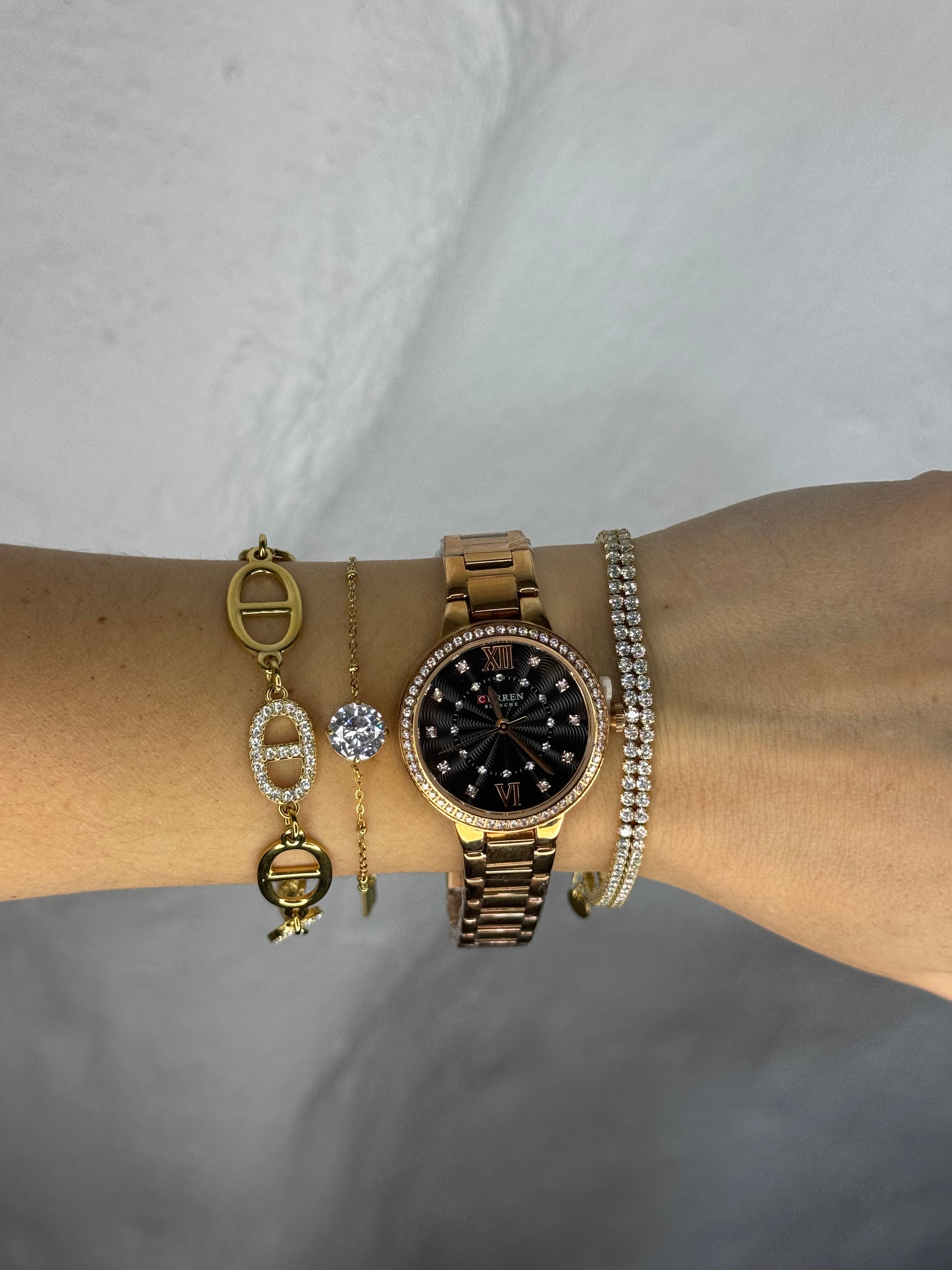 Το ÉLYA Noir είναι ένα ρολόι που αποπνέει πολυτέλεια, δύναμη και θηλυκή αυτοπεποίθηση. Με ροζ-χρυσό μπρασελέ, μαύρο καντράν με ανάγλυφη υφή και λαμπερούς κρυστάλλους περιμετρικά, συνδυάζει το σκοτάδι της νύχτας με τη λάμψη του φωτός. Ένα ρολόι-δήλωση για γυναίκες που ξέρουν τι αξίζουν.