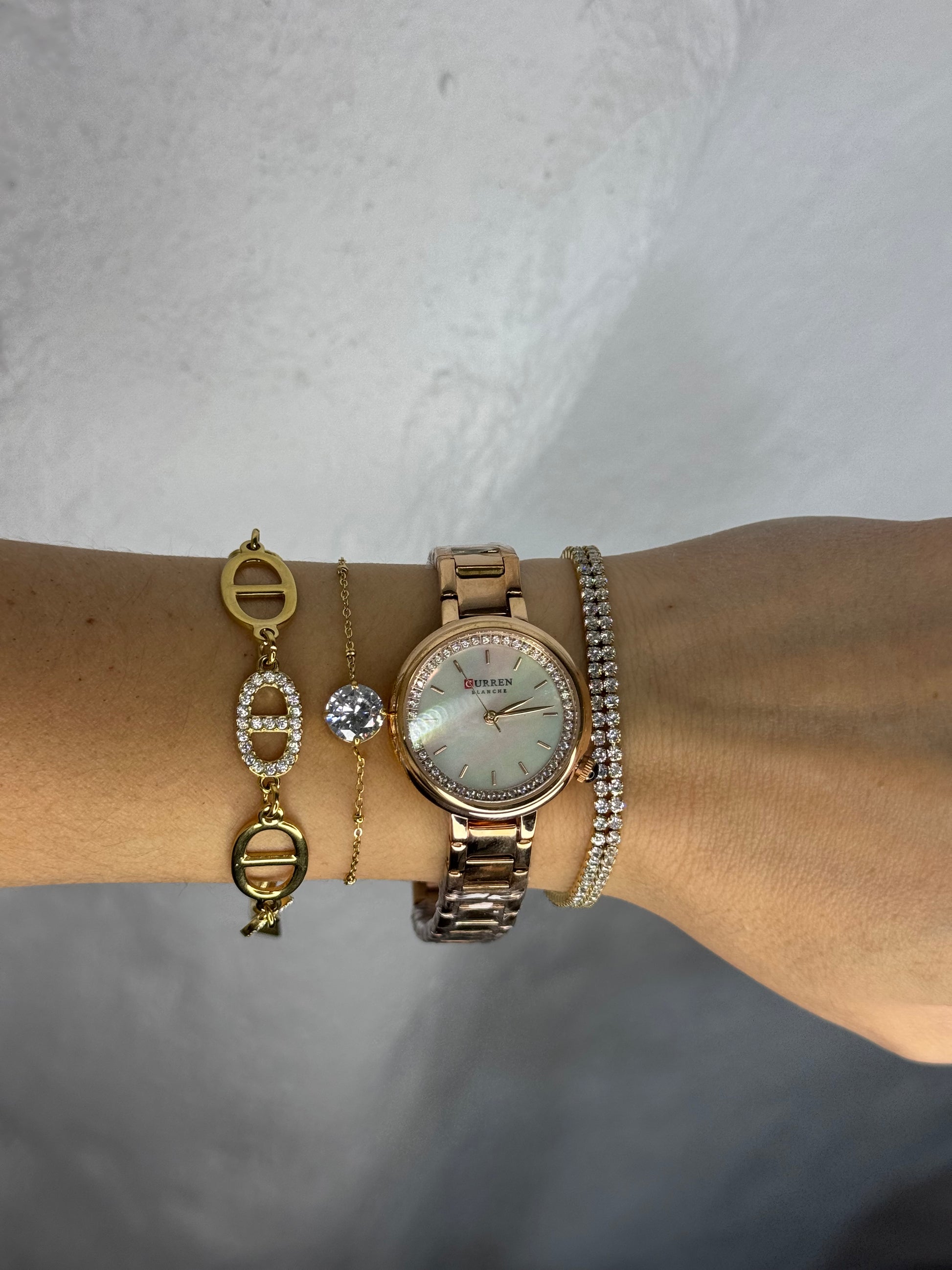 Το ÉLYA Rose – Pearl είναι η απόλυτη έκφραση της θηλυκής κομψότητας. Με ροζ-χρυσό μπρασελέ και ιριδίζον καντράν τύπου μαργαριτάρι, πλαισιωμένο από διακριτικούς κρυστάλλους, αποπνέει απαλότητα, ρομαντισμό και διαχρονική φινέτσα. Ένα ρολόι που δεν χρειάζεται τίποτα άλλο για να ξεχωρίσει.