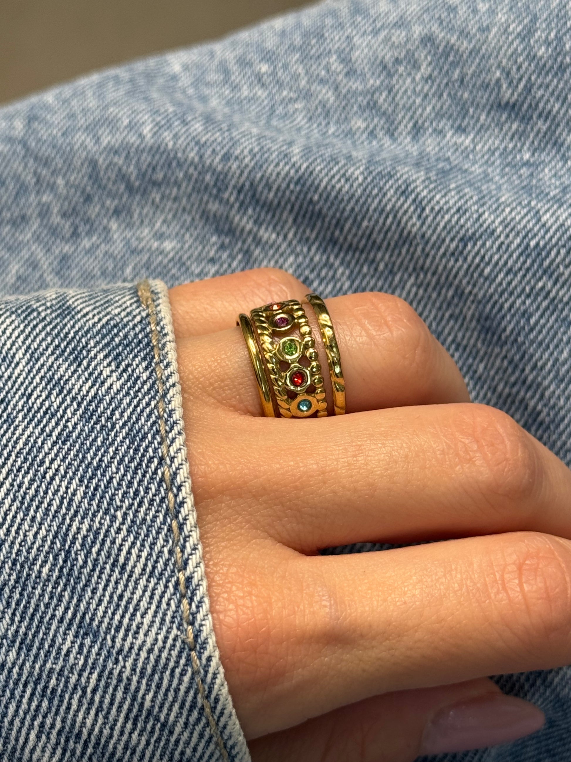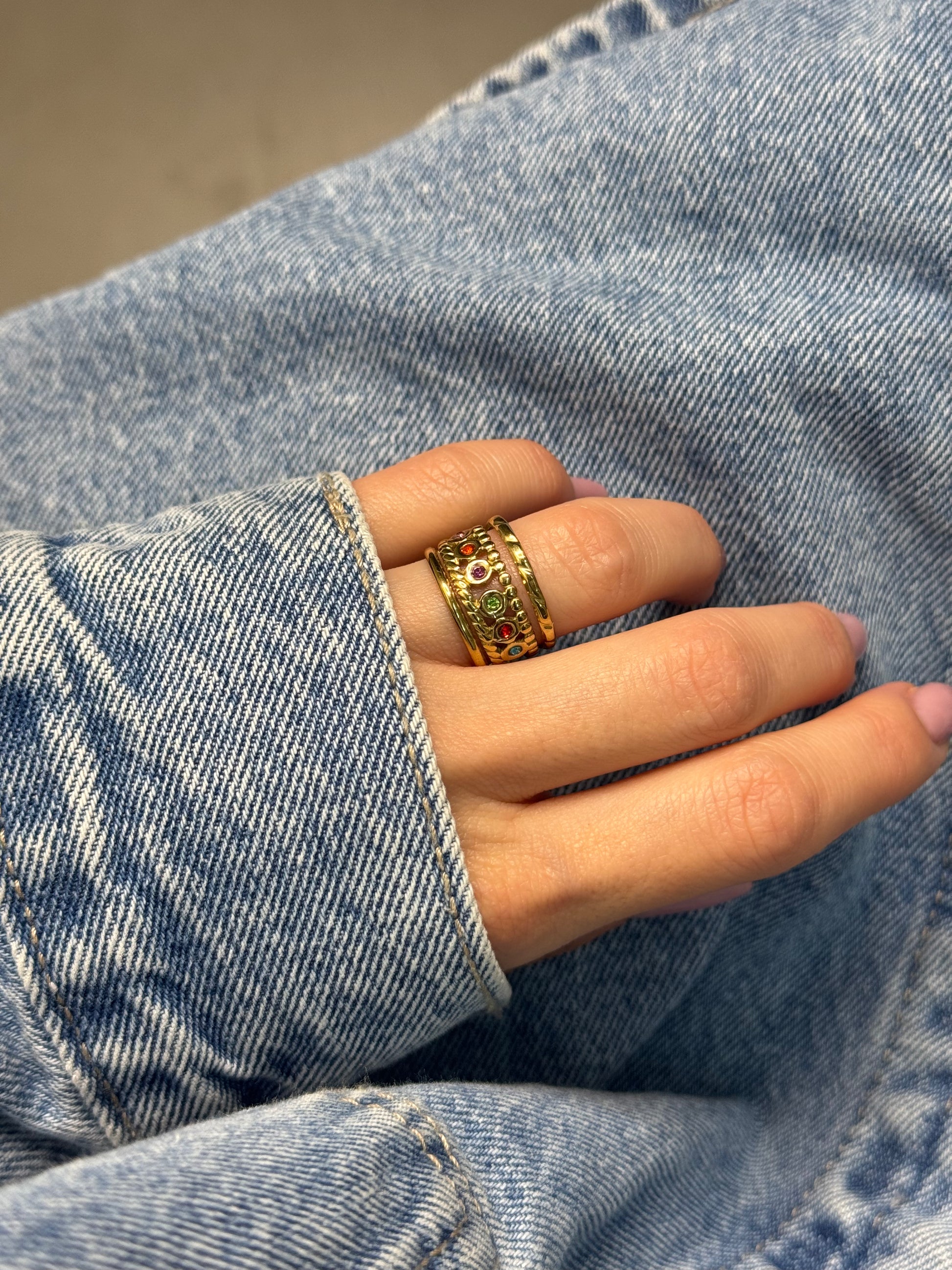 Το Ethereal Gem είναι ένα δαχτυλίδι με αυθεντικό vintage χαρακτήρα και έντονη, boho λάμψη. Οι πολύχρωμες πέτρες του προσθέτουν μια παιχνιδιάρικη αλλά κομψή πινελιά, δημιουργώντας έναν αρμονικό συνδυασμό που τραβάει τα βλέμματα. Μοναδικό statement κομμάτι που ολοκληρώνει κάθε outfit με ιδιαίτερο στυλ.