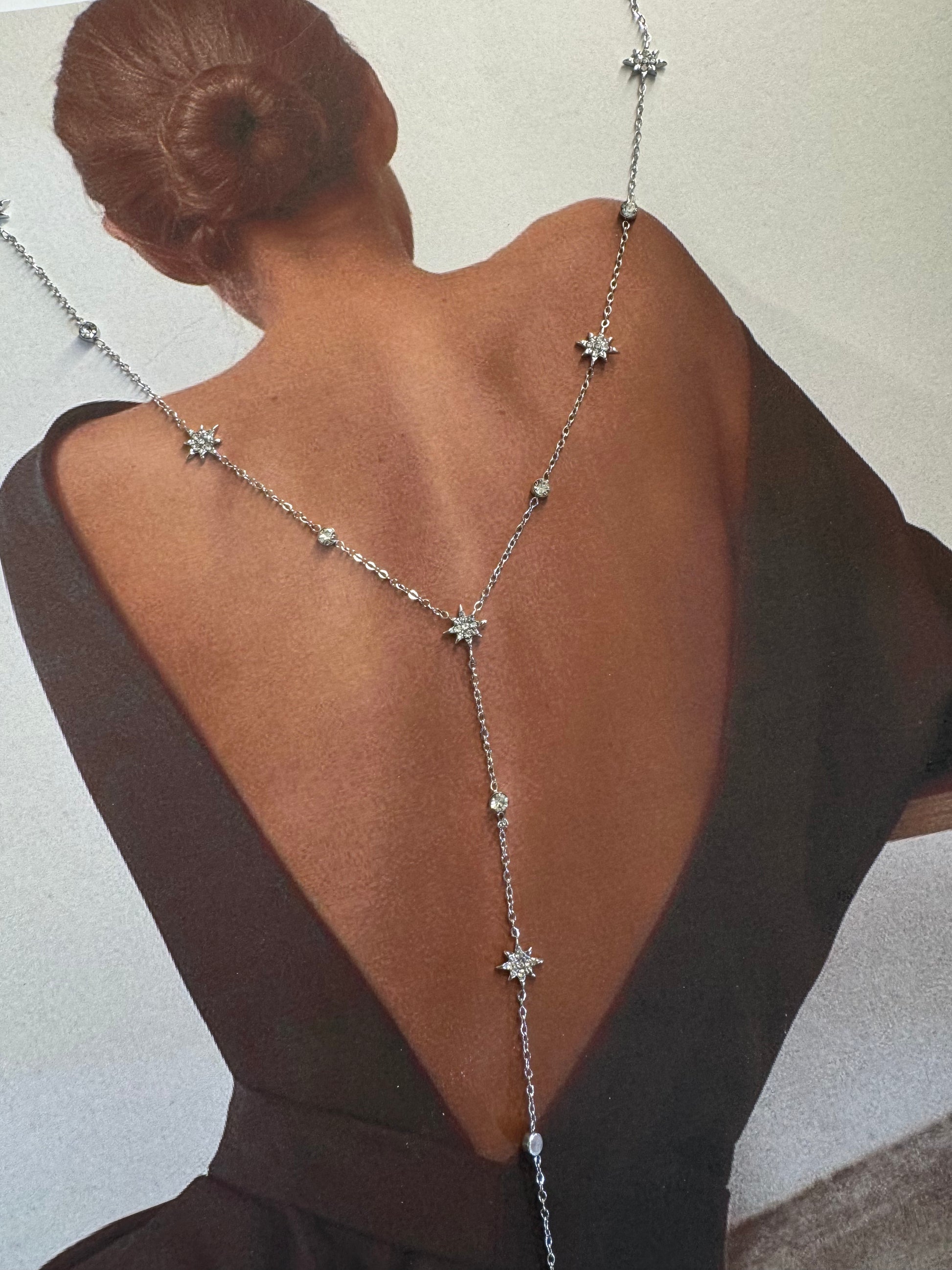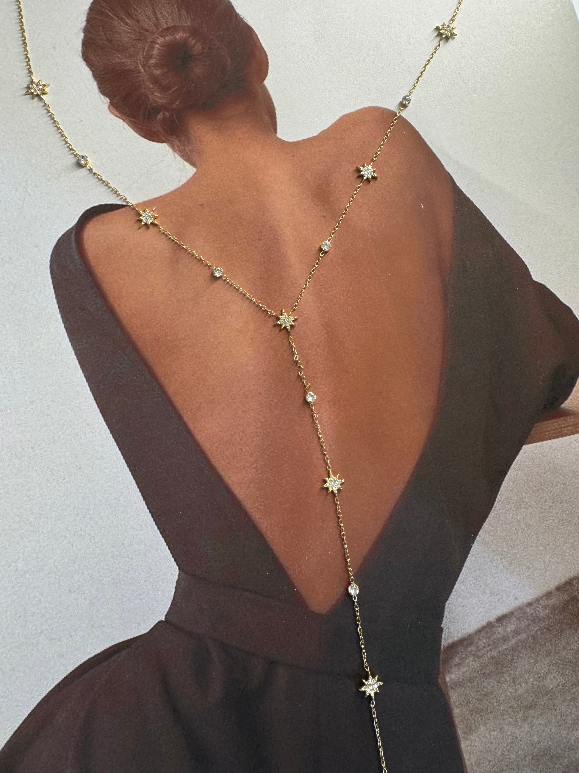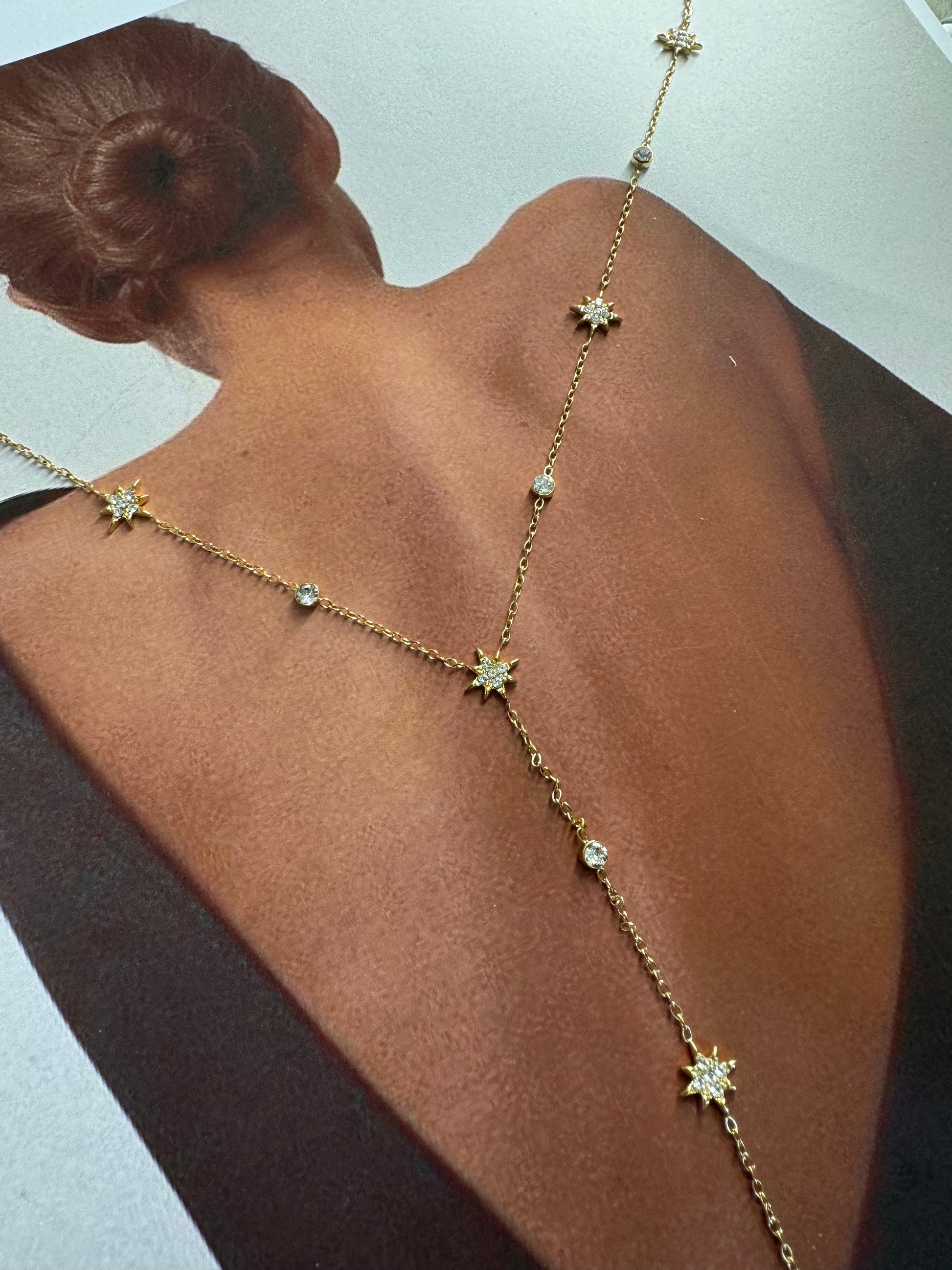 Ένα κολιέ που λάμπει σαν πεφταστέρι. Τα ζιργκόν αγκαλιάζουν κάθε λεπτομέρεια του σχεδίου, ενώ τα αστέρια δίνουν μία αίσθηση μαγείας και δυναμισμού. Η μακριά αλυσίδα που πέφτει μπροστά ολοκληρώνει το “tie effect”, χαρίζοντας κομψότητα και λάμψη σε κάθε σας εμφάνιση.