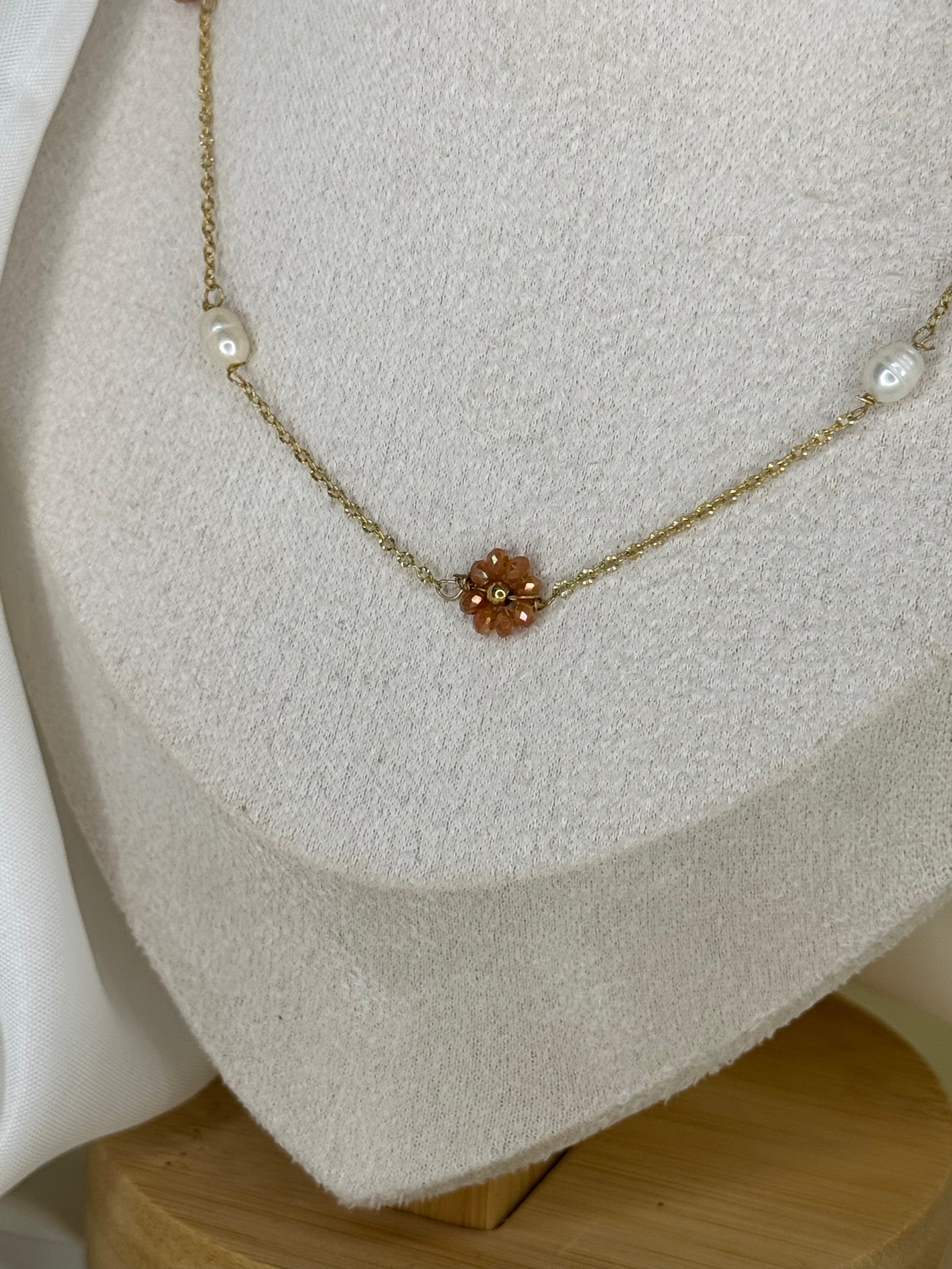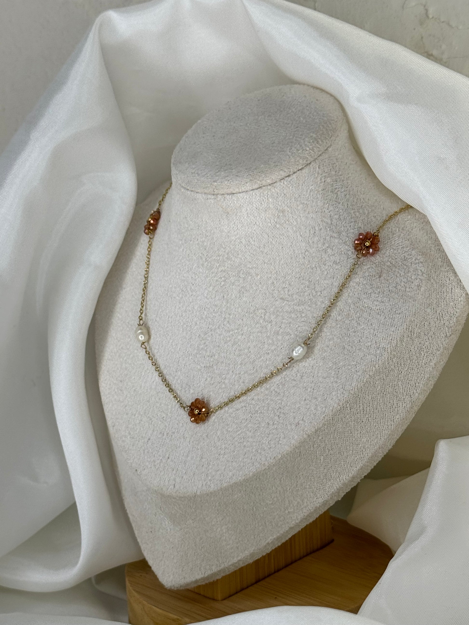 Ένα ρομαντικό κολιέ που συνδυάζει λουλουδάτα στοιχεία σε γήινες αποχρώσεις με διακριτικές πέρλες. Η χρυσή αλυσίδα αναδεικνύει τη φρεσκάδα και την κομψότητα του σχεδίου, προσδίδοντας έναν ανοιξιάτικο και θηλυκό χαρακτήρα σε κάθε look.