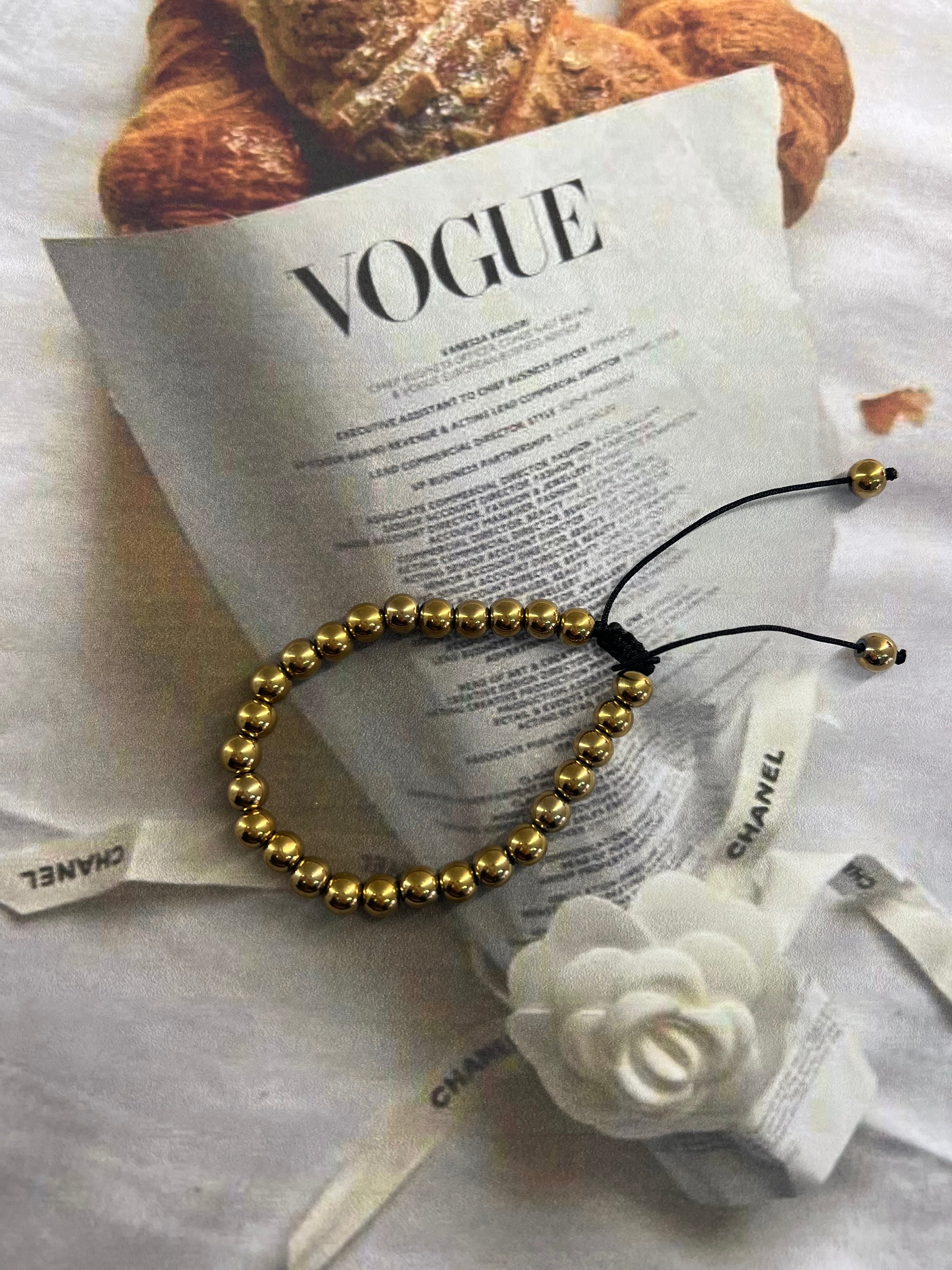 Ένα διαχρονικό βραχιόλι που εκπέμπει ζεστασιά και αυτοπεποίθηση. Οι ημιπολύτιμοι λίθοι αιματίτη σε χρυσό τόνο χαρίζουν μια μεταλλική λάμψη που αιχμαλωτίζει το φως, ενώ το μαύρο ρυθμιζόμενο κορδόνι προσθέτει μοντέρνο χαρακτήρα και τέλεια εφαρμογή. Minimal αλλά δυναμικό, φοριέται μόνο του ή σε layering με άλλα βραχιόλια, απογειώνοντας κάθε look με διακριτική πολυτέλεια.