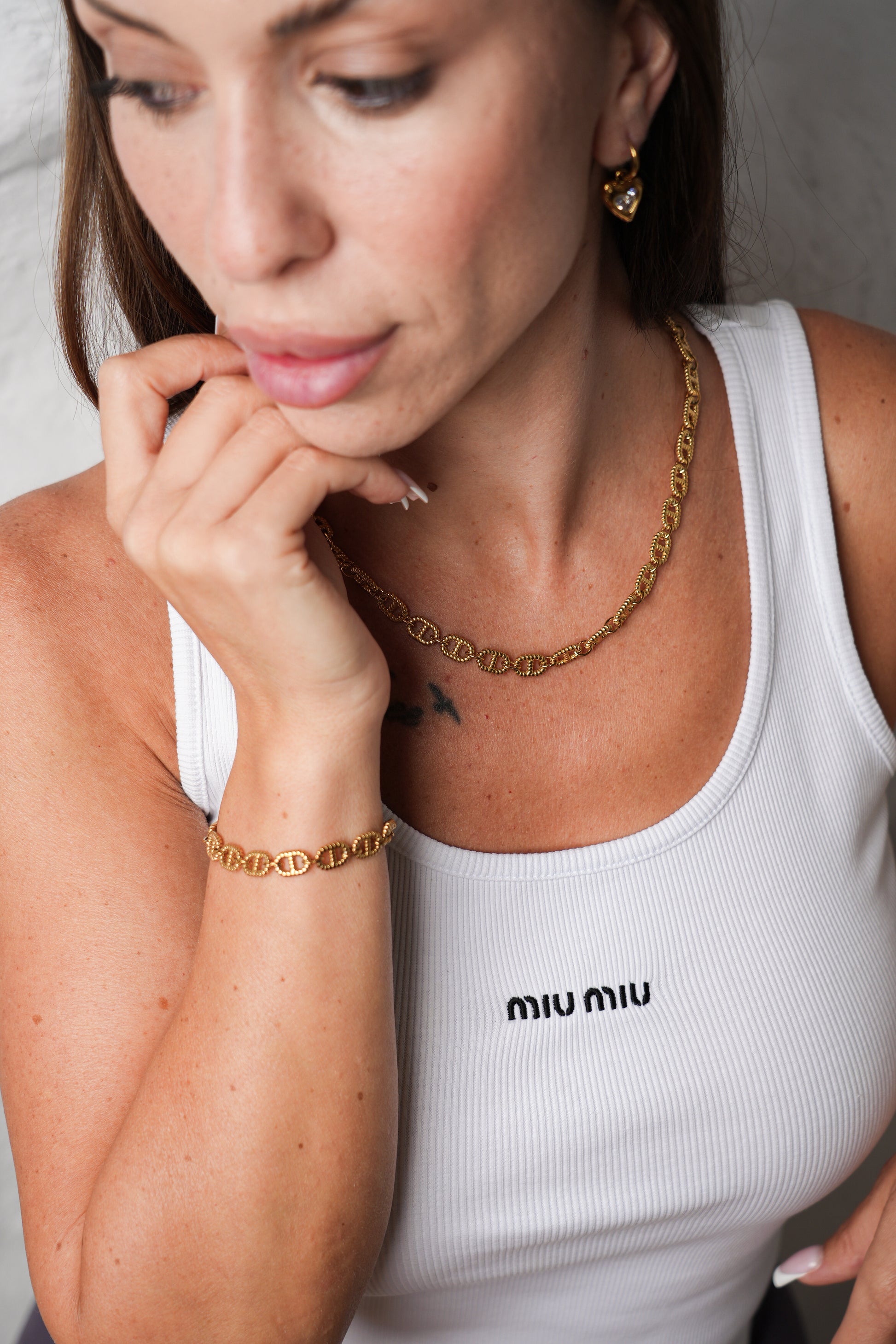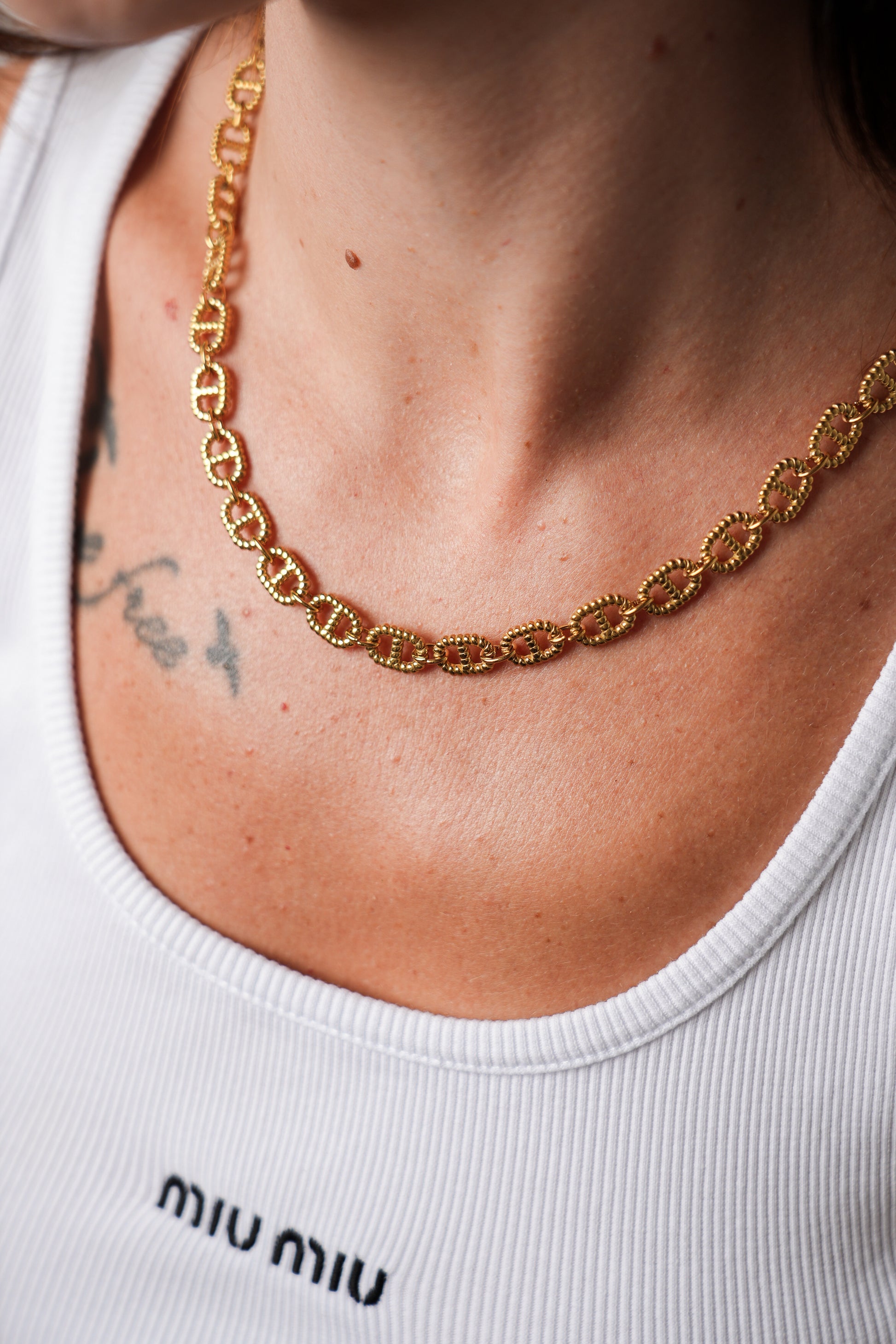 Ένα statement κολιέ που συνδυάζει τη λάμψη με τη διαχρονικότητα. Οι ιδιαίτερες αλυσίδες του με περίτεχνη λεπτομέρεια δημιουργούν ένα κομψό και εντυπωσιακό αποτέλεσμα, ιδανικό για να απογειώσει κάθε σας εμφάνιση, από το πρωί έως το βράδυ.