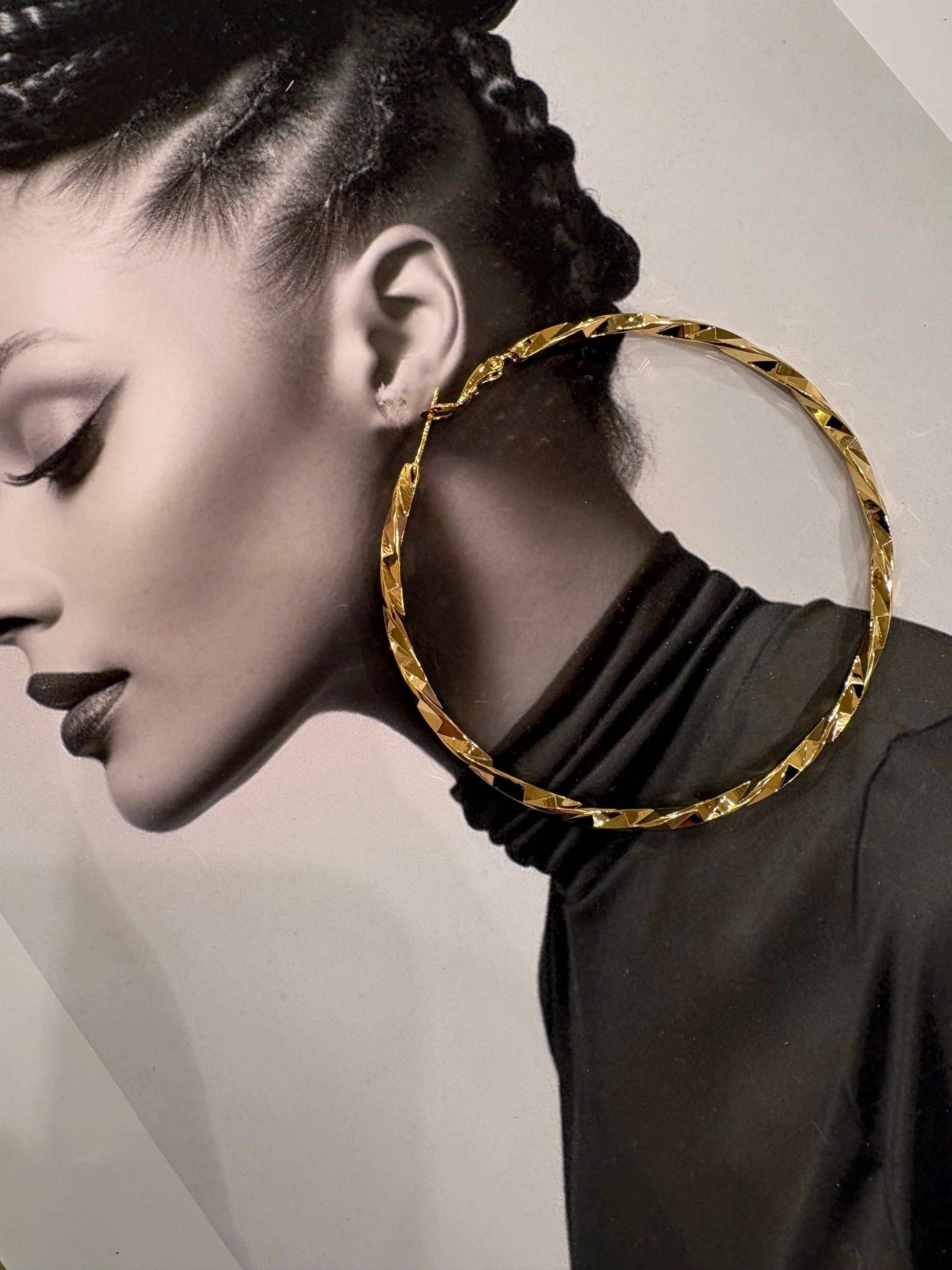 Ένα χρυσό hoop με κοψίματα τύπου facet που παίζουν με το φως σε κάθε κίνηση.