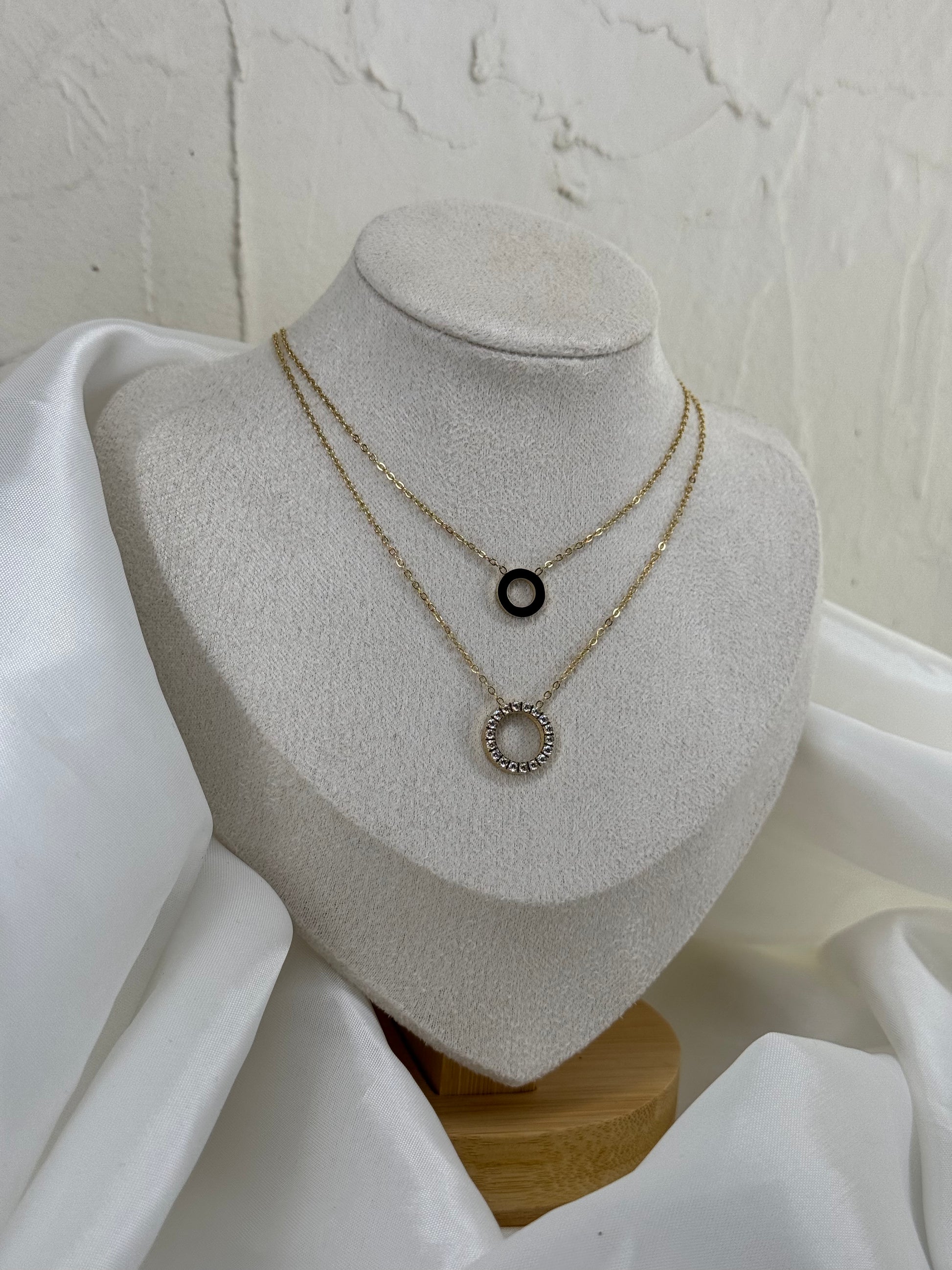 Ένα διπλό κολιέ που αποτυπώνει την ισορροπία ανάμεσα στη διακριτικότητα και τη λάμψη. Η λεπτή χρυσή αλυσίδα αγκαλιάζει το λαιμό και καταλήγει σε δύο κύκλους: ο μικρότερος αποπνέει την απλότητα του χρυσού, ενώ ο μεγαλύτερος στολισμένος με ζιργκόν χαρίζει φωτεινές αντανακλάσεις σε κάθε κίνηση. Ένα κόσμημα διαχρονικό και κομψό, ιδανικό για όλες τις ώρες.