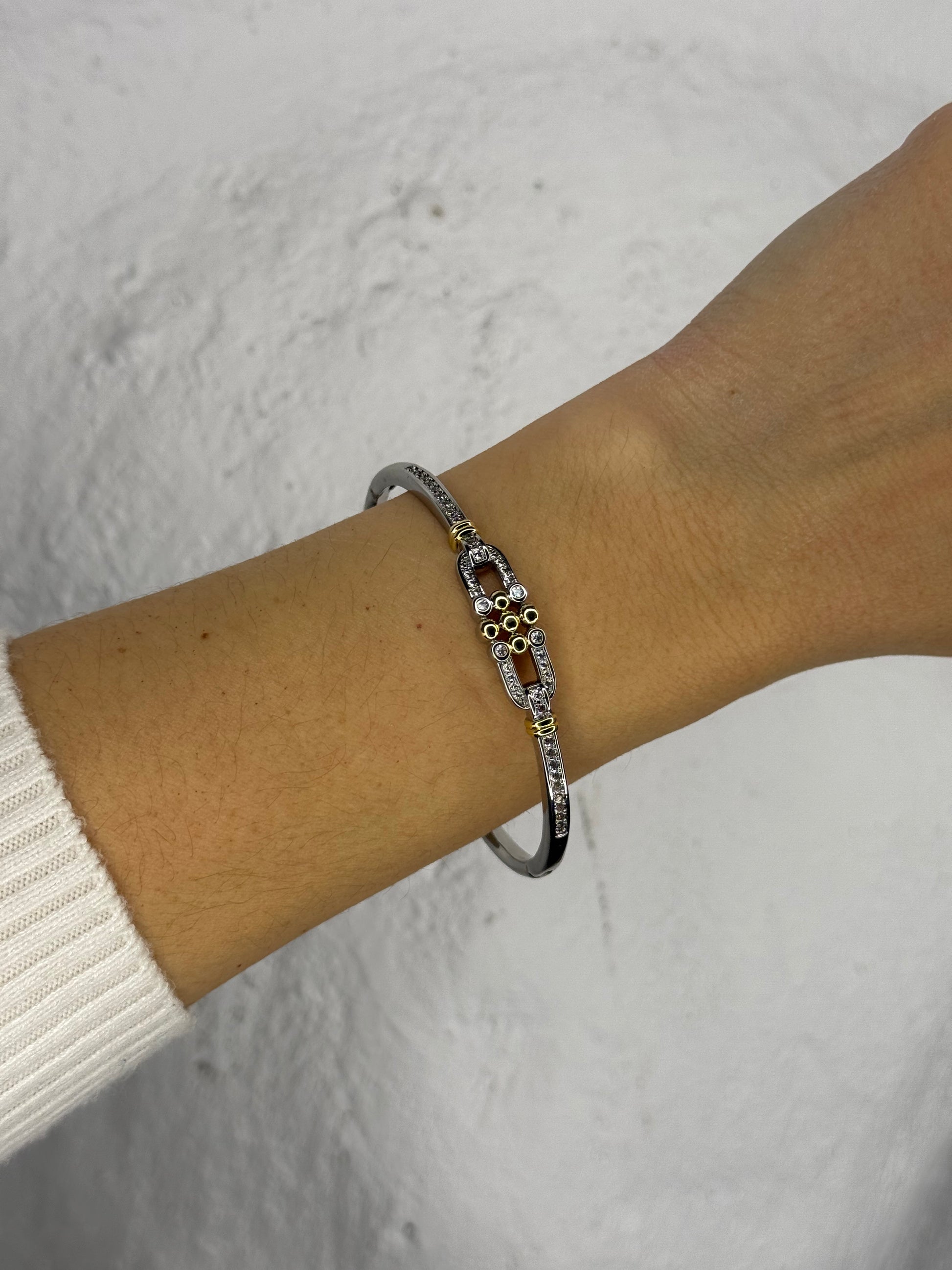 Μια χειροπέδα που παίζει με τη γεωμετρία και τη λάμψη. Ο κεντρικός κρίκος, διακοσμημένος με μικρούς χρυσούς κύκλους και λαμπερά κρύσταλλα, δημιουργεί ένα σημείο εστίασης που τραβάει το βλέμμα με ισορροπημένη κομψότητα. Το λεπτό ασημί σώμα της χειροπέδας προσθέτει καθαρότητα και premium χαρακτήρα, ιδανική για όσες αγαπούν τα signature κομμάτια που ξεχωρίζουν χωρίς υπερβολή.