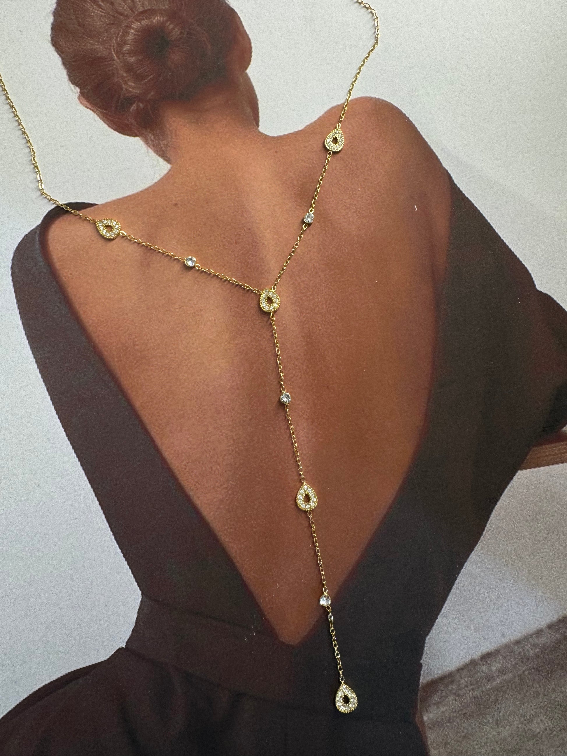 Ένα κολιέ που μοιάζει να στάζει φως. Οι σταγόνες διακοσμημένες με ζιργκόν, συνθέτουν μία κομψή αλυσίδα που καταλήγει μπροστά σε μακρύτερο σχέδιο, θυμίζοντας δελεαστική γραμμή στο ντεκολτέ. Κομψό και εντυπωσιακό, συνδυάζει την αίσθηση πολυτέλειας με τη θηλυκή φινέτσα.