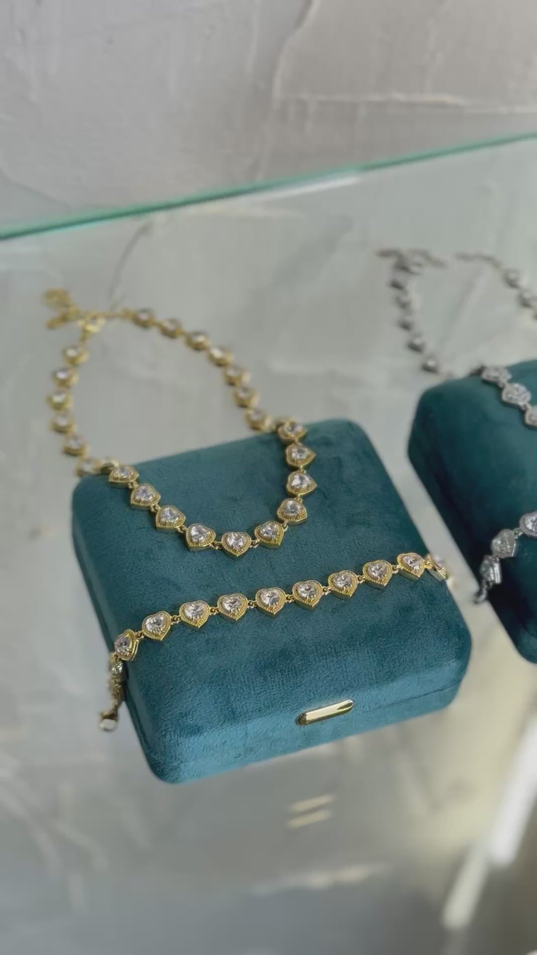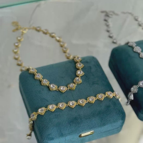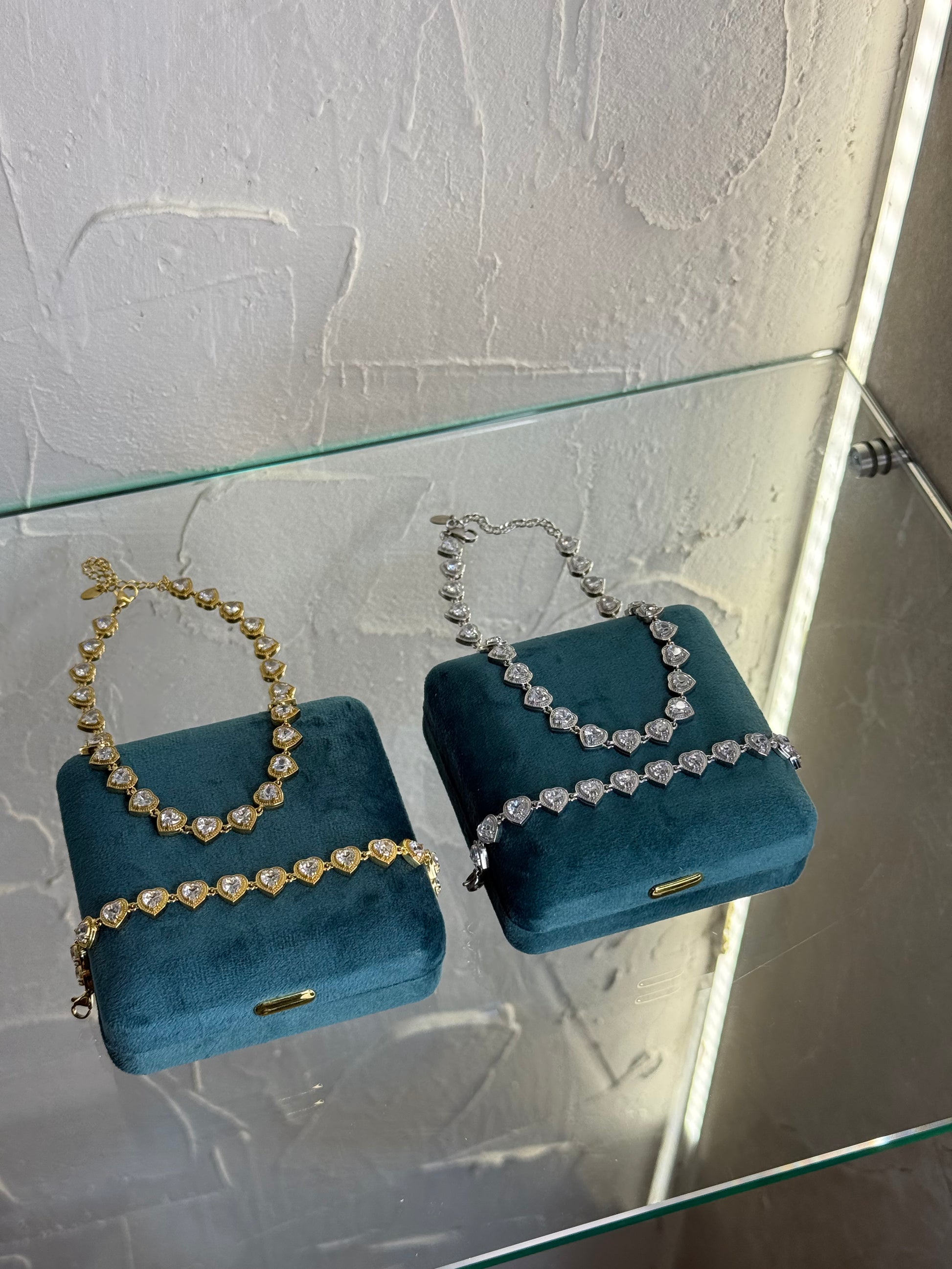 Λαμπερό σετ κολιέ και βραχιόλι από ανοξείδωτο ατσάλι, διακοσμημένο με καρδιές από ζιργκόν που αιχμαλωτίζουν το φως σε κάθε κίνηση. Διατίθεται σε χρυσό και ασημί για να ολοκληρώνει κάθε εμφάνιση με ρομαντική λάμψη.