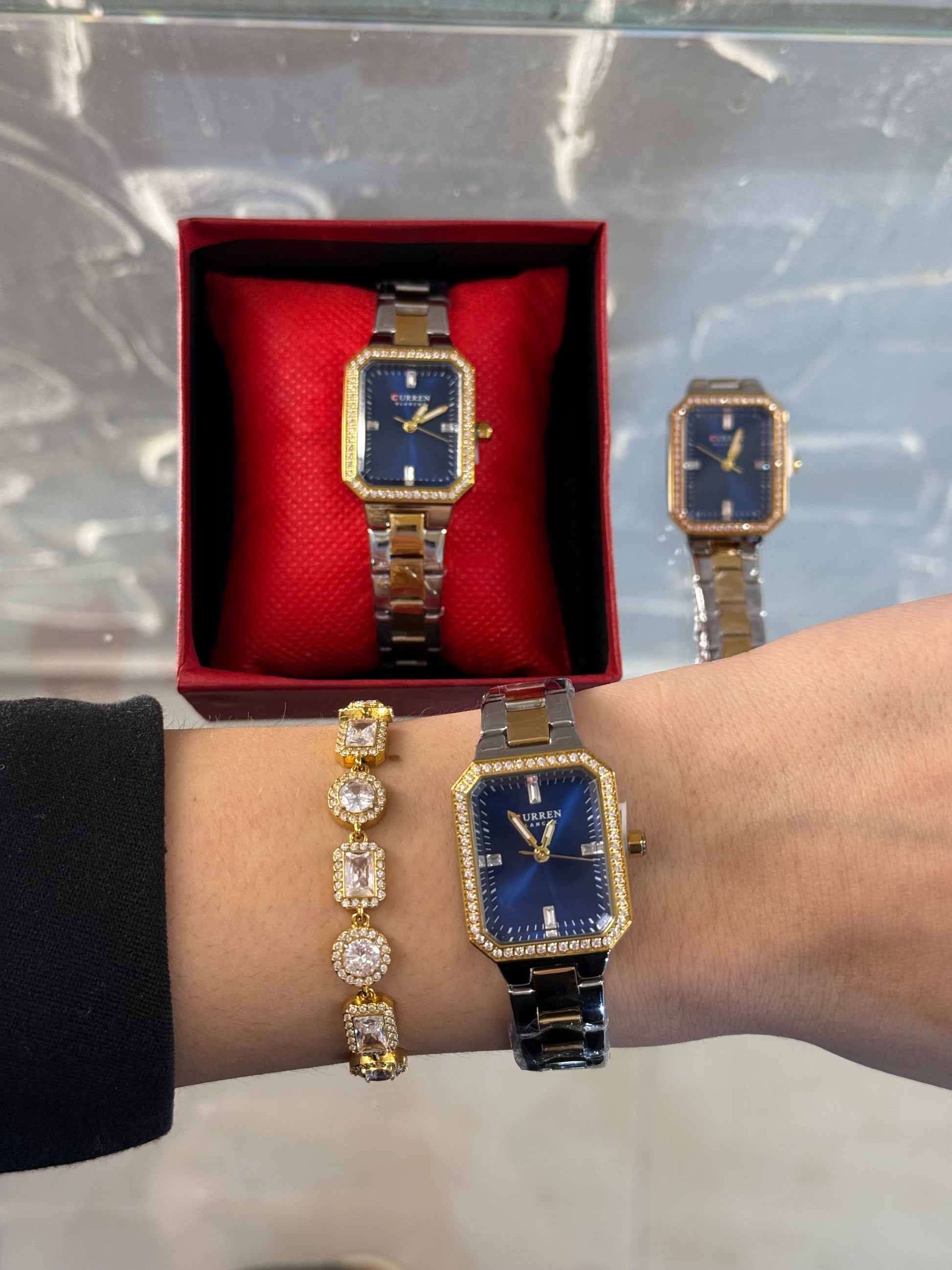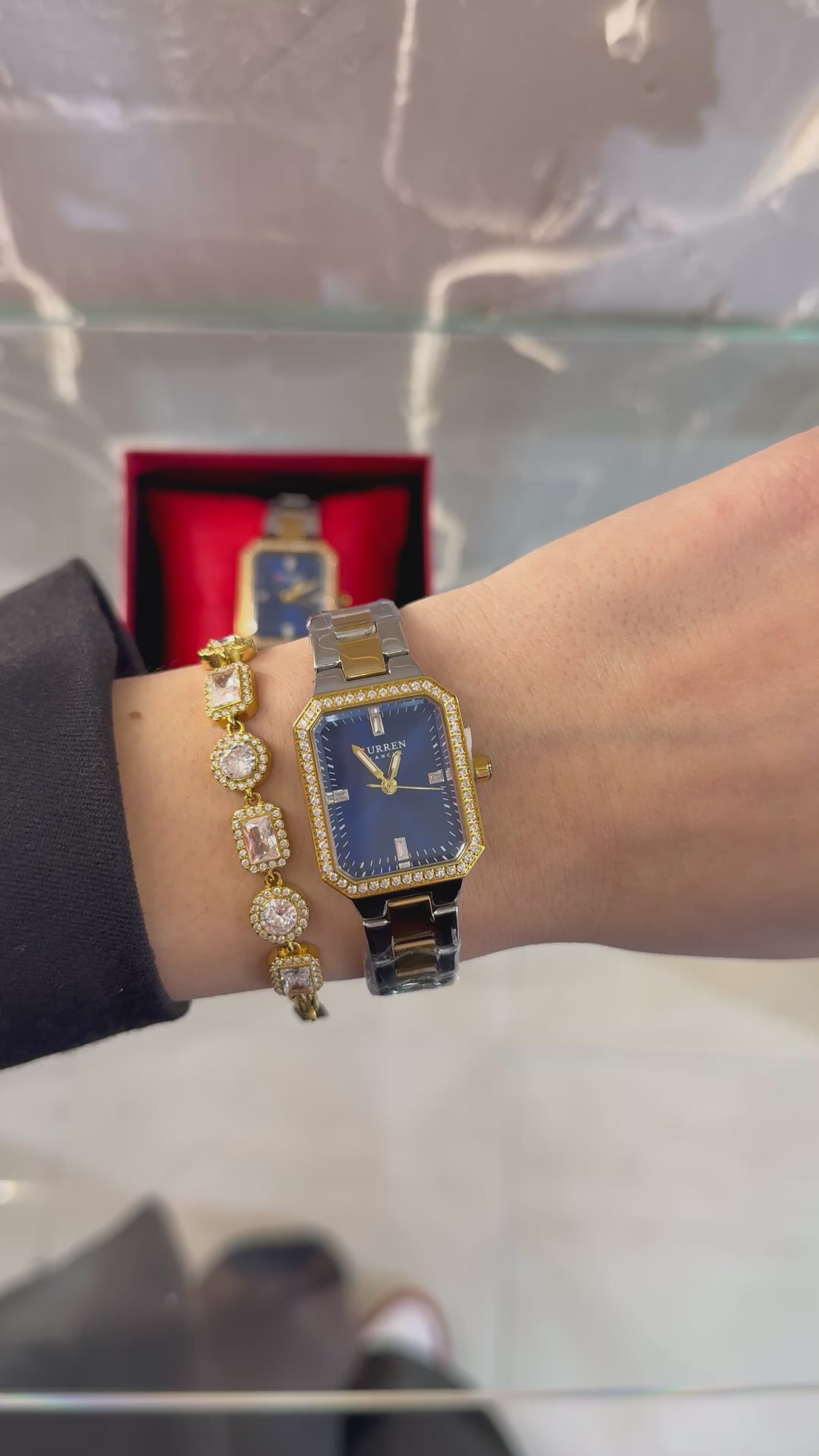 Γυναικείο Παραλληλόγραμμο Ρολόι Δίχρωμο με Μπλε IΚαντράν & Στρας boo