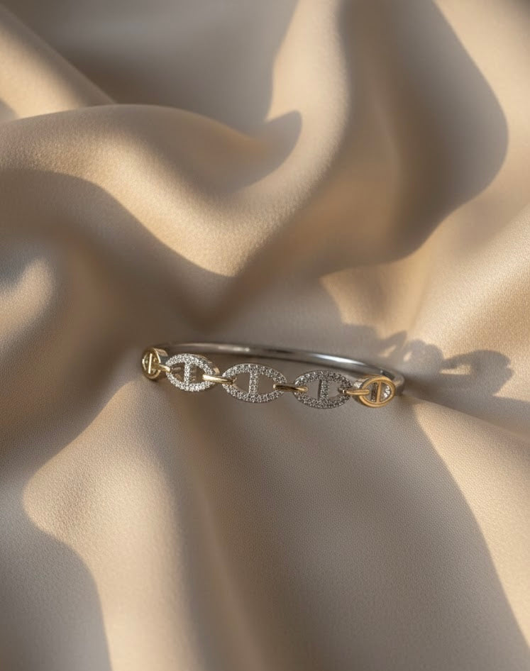 Μια χειροπέδα που αποτυπώνει την αδιάκοπη ροή του φωτός. Οι interlocking κρίκοι, στολισμένοι με λαμπερούς κρυστάλλους και χρυσές λεπτομέρειες, δημιουργούν ένα διαχρονικό μοτίβο που συμβολίζει συνέχεια, κομψότητα και premium αισθητική. Ένα κόσμημα που λειτουργεί σαν signature touch σε κάθε εμφάνιση, ήρεμο, λαμπερό, ολοκληρωμένο.