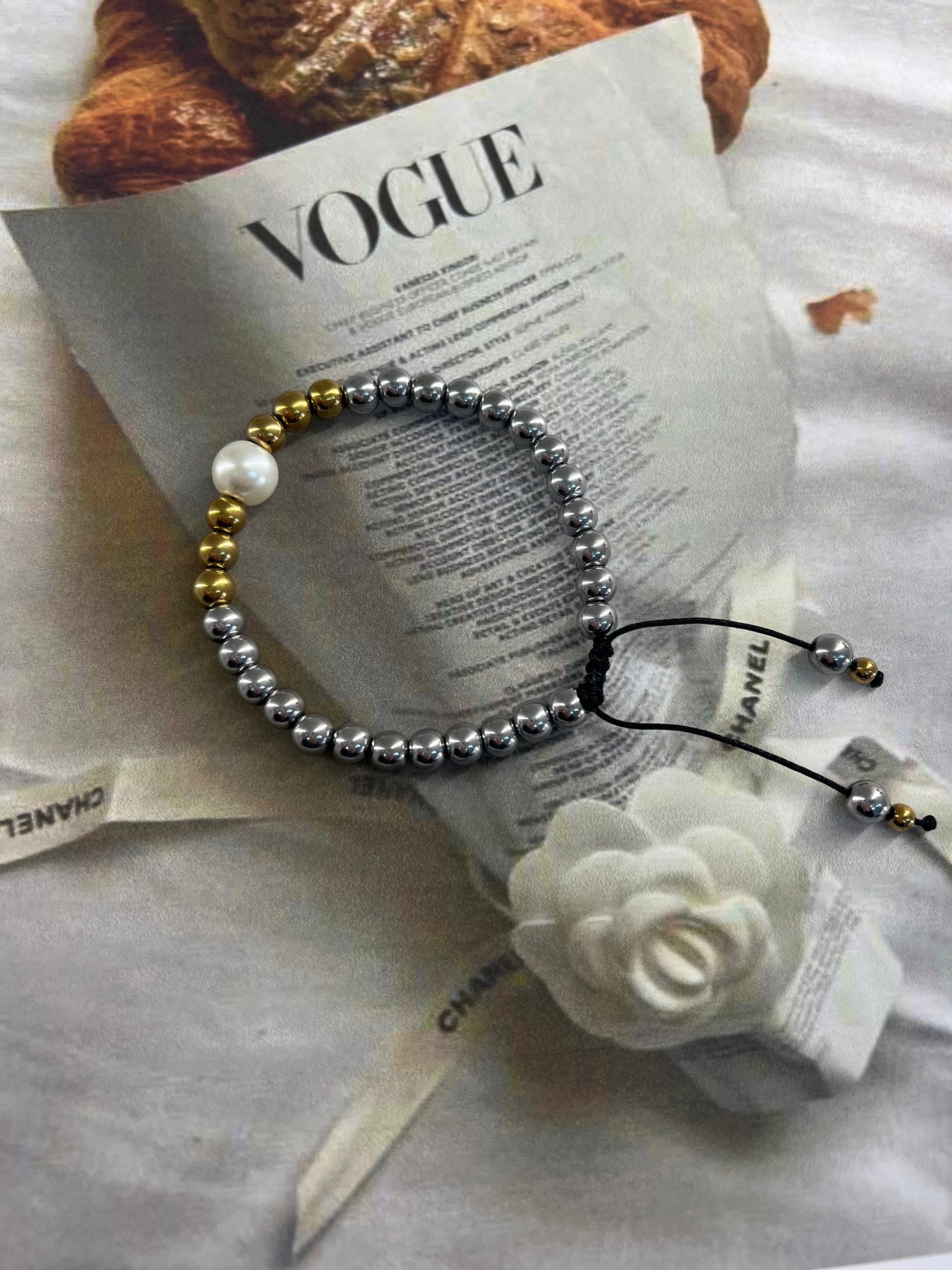 Ένα βραχιόλι που αποπνέει κομψότητα μέσα από την αντίθεση και την ισορροπία. Οι αιματίτες σε χρυσό και ασημί τόνο ενώνονται με μια λευκή γυάλινη πέρλα ανώτερης ποιότητας, δημιουργώντας έναν μοναδικό συνδυασμό φωτός και μετάλλου. Το ρυθμιζόμενο μαύρο κορδόνι χαρίζει άνεση και τέλεια εφαρμογή, κάνοντάς το ιδανικό τόσο για minimal εμφανίσεις όσο και για elegant layering.