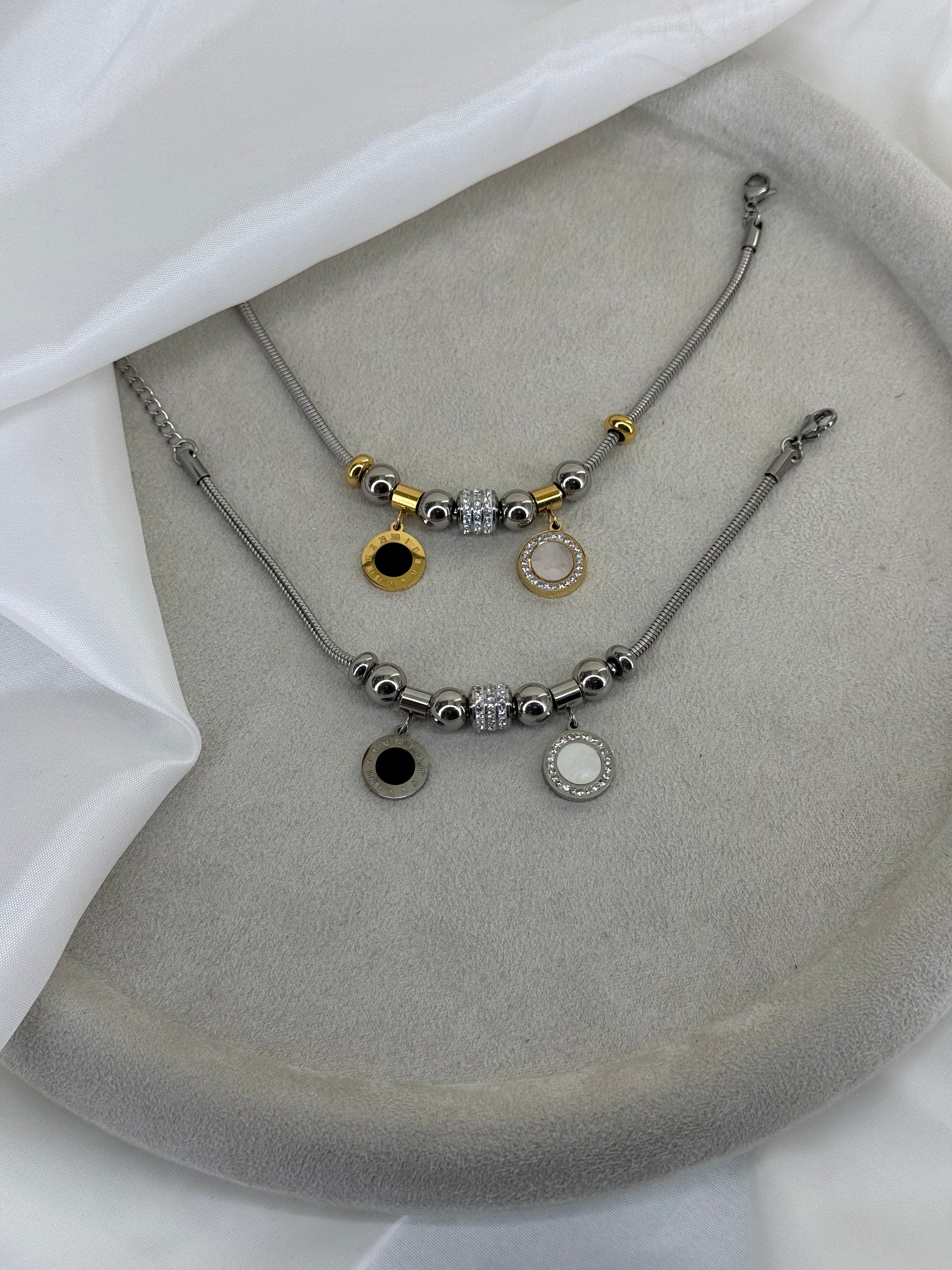 Ένα βραχιόλι εμπνευσμένο από την αρμονία του φεγγαριού και του φωτός. Η αλυσίδα σε ασημί stainless steel αγκαλιάζει τον καρπό, ενώ οι διακριτικές λεπτομέρειες, είτε σε total silver είτε σε συνδυασμό με χρυσό, χαρίζουν κομψότητα και διαχρονικότητα. Ιδανικό για να φορεθεί μόνο του ή σε layering με άλλα κοσμήματα, αποτελεί ένα κόσμημα που ταιριάζει σε κάθε περίσταση.